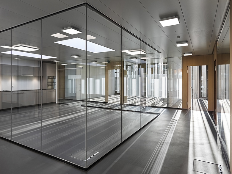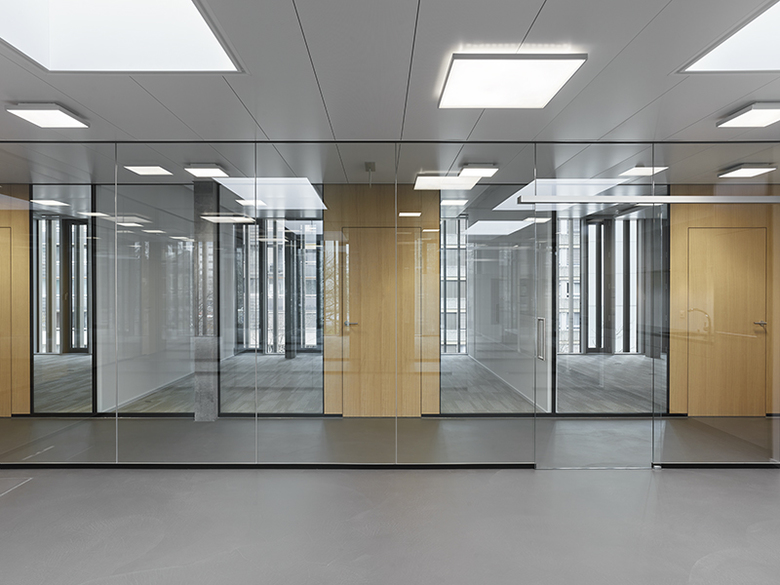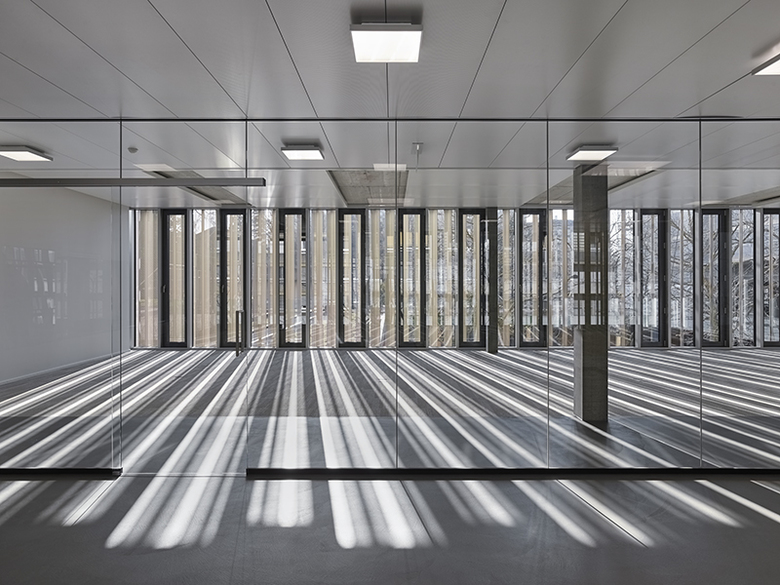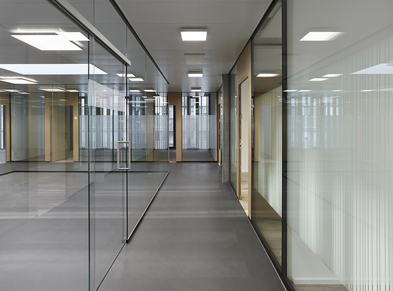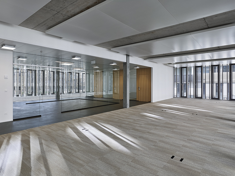Der Neubau wird zurückversetzt vom Scheibenhochhaus des Fellerguts als eigenständiger Kör-per positioniert. Der Zentrumshof wird aufgewertet, die städtebauliche Situation geklärt und nachhaltig verbessert. Das Bürogebäude ist als zweigeschossiger Pavillon mit einem Sockelge-schoss konzipiert. Das bestehende Untergeschoss bleibt erhalten. Eine Fassade mit bronzefar-benen Vertikallamellen bindet die beiden Obergeschosse optisch zusammen. Die vorgehängten, gelochten Metalllamellen umgeben den Pavillon wie einen Vorhang. Die perforierte Schicht ge-währt den Ausblick aus dem Inneren, filtert jedoch das Sonnenlicht und den Einblick von Aussen.