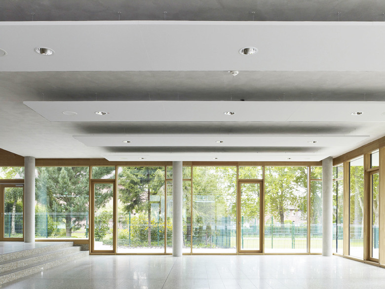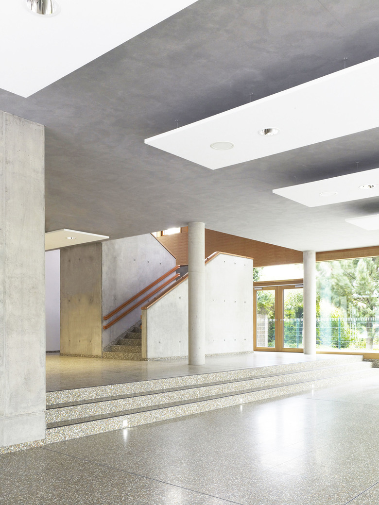Oberlichtelemente und Lufträume versorgen die Flure in beiden Geschossen mit Tageslicht. Das Energiekonzept mit Geothermieanlage zur Beheizung und Bauteilaktivierung zur Kühlung in Kombination mit einer kontrollierten Lüftung mit Wärmerückgewinnung gemäß des Passivhausstandards gewährleistet eine Optimierung der Betriebskosten und erhöht die Behaglichkeit.