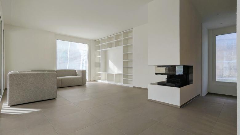 Das Wohnhaus vereint moderne Architektur mit klarer Formensprache und harmonischer Einbettung in die umgebende Landschaft. Die kubische Grundstruktur wird durch das geneigte Dach aufgelockert und schafft eine zeitlose Silhouette, die sich unaufdringlich in die Nachbarschaft einfügt. Großzügige Fensterflächen öffnen das Haus zum Garten und lassen innen und aussen vereinen.