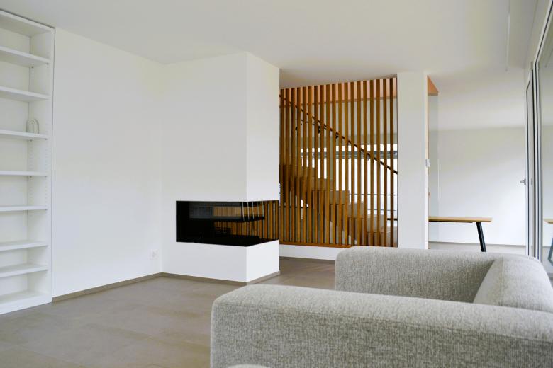Die Treppe, mit filigranen Holzlamellen eingefasst, verbindet die Ebenen und wird selbst zu einem architektonischen Highlight. Helle Farben und gezielt gesetzte Sichtachsen verleihen den Räumen Weite und Transparenz. So entsteht ein Wohnhaus, das Funktionalität, Ästhetik und Geborgenheit miteinander verbindet – ein Ort, der gleichermaßen Rückzug wie Offenheit ermöglicht.