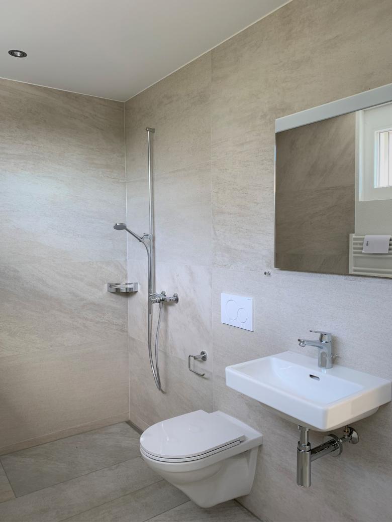 Leicht unterhalb der Strasse liegen der Eingang, Kochen/ Essen/ Wohnen, ein Arbeits- oder Gästezimmer und eine Dusche. Die sehr grosszügige Terrasse wird durch das Gebäude und der Garage von der kleinen Quartierstrasse abgeschirmt.