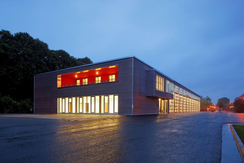 Die großen, gläsernen Tore geben den Blick in die Fahrzeughalle frei und bilden die Schauseite zur Stadt. Die Fassade ist mit einem Aluminium-Lochblech verkleidet, welches die dahinterliegenden Fenster vor Verschmutzung schützt und als Sonnenschutz dient. Einzelne Bereiche werden geöffnet und zeigen die zurückspringende, rote Fassade.