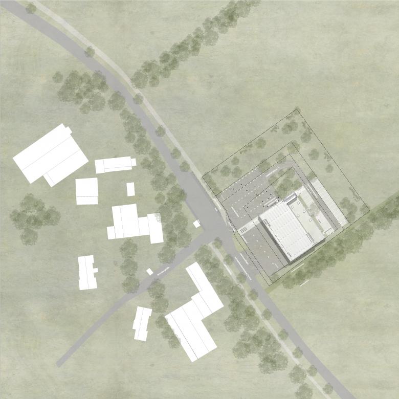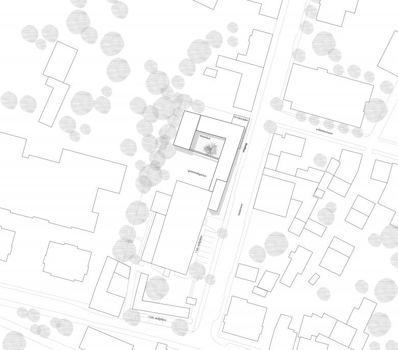 Der Neubau des Gemeindehauses legt sich L-förmig als 1-geschossiger Baukörper entlang der Badstrasse und der nördlichen Grundstücksgrenze. Dadurch entsteht im Innern des Grundstücks ein grüner Freiraum, der an einen Kloster- bzw. Pfarrgarten erinnern soll.