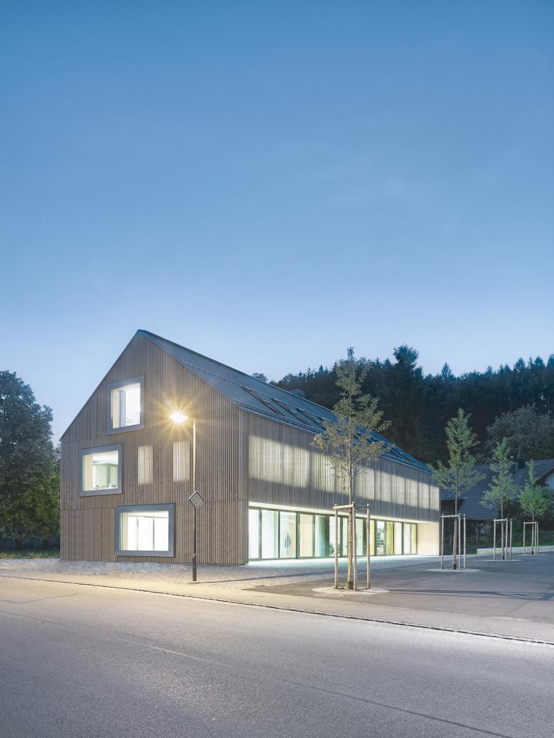 Die Gemeinde Gampelen, eingebettet zwischen Neuenburgersee und Jolimont, hat zur Belebung des Dorfzentrums in Nachbarschaft zur Kirche, Gemeindeverwaltung und Schule ein neues Gebäude mit Mehrzwecksaal, Kindertagesstätte und Ärztezentrum errichtet. Gleichzeitig wurde die Umgebung des ganzen Perimeters im Dorfzentrum als öffentlicher Aussenraum gestaltet. Dieser ermöglicht verschiedenste Nutzungen wie Feste und Märkte. Das neue Gebäude passt sich sowohl in Grösse als auch in Form in den durch grosse Einzelbauten geprägten Ortskern ein. Das Gebäude ist als klares, länglich ausgerichtetes Volumen konzipiert, das alle Funktionen unter einem Dach zusammenfasst. Mit einem über die gesamte Länge der Ostfassade reichenden, gedeckten Aussenbereich orientiert sich das Gebäude zum neuen Dorfplatz. Dieser Raum greift das Thema der grossen Vordächer der alten Bauernhäuser in der Umgebung auf, ist gedeckte Aufenthaltszone und markiert die Zugangsfassade. Der Mehrzwecksaal und die Kindertagesstätte sind direkt von der Eingangshalle aus über grosszügige Eingänge erschlossen. Diese beiden stützenfreien Räume orientieren sich mit raumhohen, öffenbaren Fenstern in der westlichen und östlichen Fassade gegen den Platz und gegen den Garten. So ist eine Nutzung des Saals im Zusammenhang mit Veranstaltungen im Freien möglich. Die Kinder der Tagesstätte profitieren von einem direkten Zugang zum Garten. Diese Räume können leicht auch für andere als die zurzeit geplanten Nutzungen angepasst werden. Im Ober- und Dachgeschoss ist das Ärztezentrum angeordnet. Der Grundriss ist gekennzeichnet von einer Serie von gleichgrossen Raumzellen, die entlang der Ost- und Westfassaden angeordnet sind.