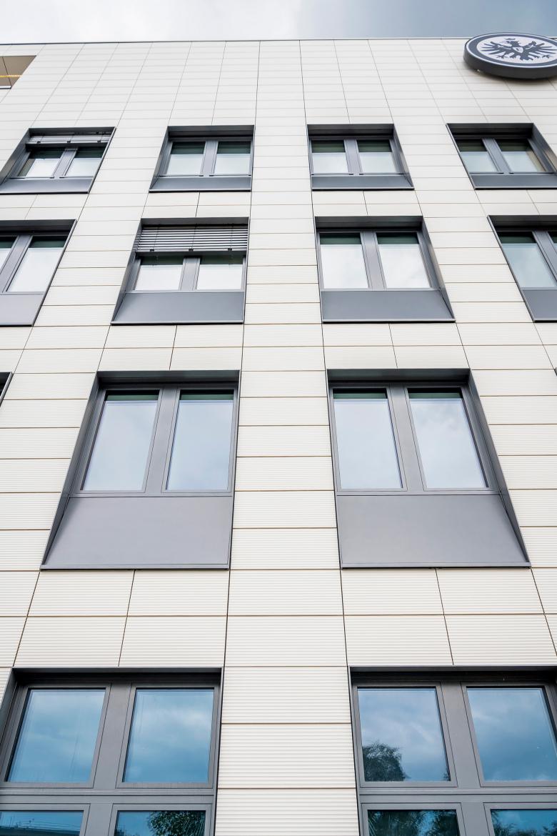 Die Farbgebung der Fassade interpretiert die Vereinsfarben der Eintracht Frankfurt – schwarz und weiß: Fassadenprofile, Brüstungsbekleidungen und Zargen erhalten eine anthrazit-graue Farbgebung und kontrastieren mit dem hellen Keramikmaterial der opaken Flächen. Die Planung des Neubaus erfolgt in Anlehnung an den Passivhaus-Standard. Für das Bauvorhaben ist als nachhaltiges und effizientes Energiekonzept eine Kombination aus Solarthermie, Wärmepumpen und einem Erdsolespeicher in Verbindung mit Heiz- und Kühlflächensystemen geplant. Es wird damit eine CO2-Einsparung von rund 783 to/Jahr erzielt. Der Anteil erneuerbarer Energien liegt bei rund 70%. Das Gebäude ist vollflächig mit einer energieeffizienten Lüftungsanlage sowie durchgängig mit LED – Beleuchtungstechnik mit bedarfsabhängiger Lichtsteuerung ausgestattet. Das Entwurfskonzept für den Freiraum folgt dem Leitbild der Dynamik mit klaren Wegebeziehungen und Abfolgen spannender Räume und Nutzungszonen.