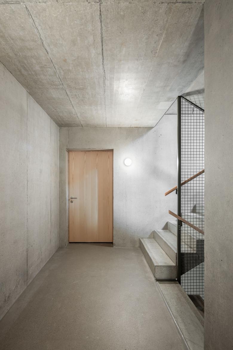 Über einen Verbindungsgang im Untergeschoss werden die beiden Baukörper miteinander verbunden. Die Parkgarage wird von beiden Häusern gemeinsam genutzt. Durch die exzentrisch gesetzten Erschliessungskerne entsteht ein diverser Wohnungsmix: 2.5-, 3-, sowie 3.5-Zimmer-Wohnungen. Alle Wohnungen sind barrierefrei erschlossen. Das Bauernhaus wird hinsichtlich verdichteter Bauweise von einer Wohneinheit in neu 4 Wohnungen transformiert. Der Erschliessungsturm mit Balkonflächen dockt als filigrane Stahlkonstruktion an die nördliche Fassade an und spielt gegenüber dem Bestand zusätzliche Wohnfläche frei.