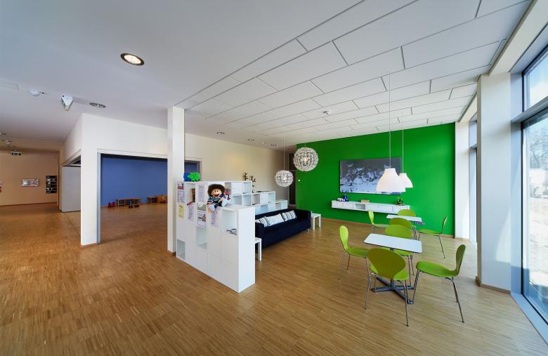 Der zweigeschossige Neubau ist modern und behindertengerecht gestaltet. Das Herzstück des Gebäudes bildet die Kindertagesstätte im Erdgeschoss, wo 60 Kinder ganztägig betreut werden. 30 Krippen- und 30 Elementargruppenplätze wurden geschaffen. Eine große Bewegungsfläche, welche zum Turnen, Spielen und für kleine Feste genutzt wird, bildet die Raummitte, um die sich Gruppenräume mit großzügigen Verglasungen Richtung Garten orientieren.