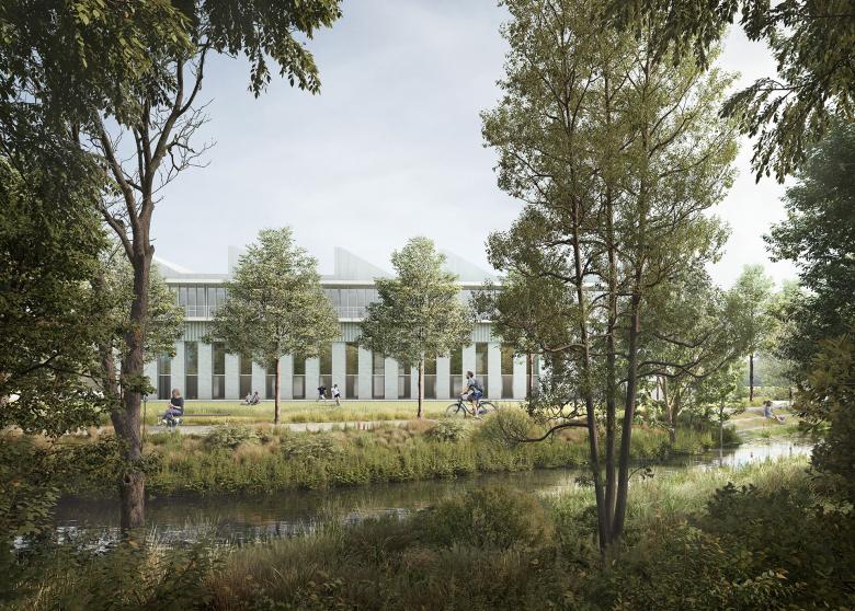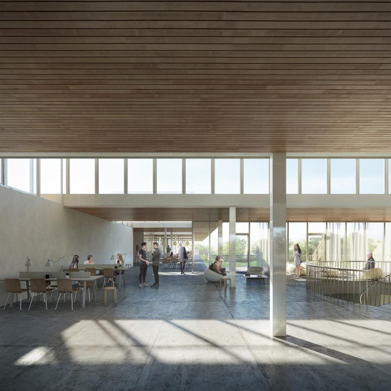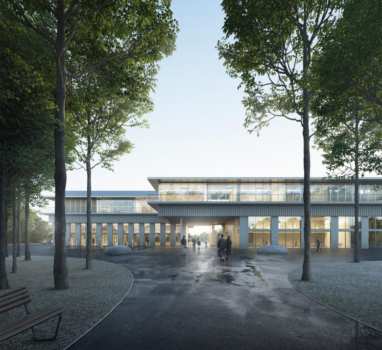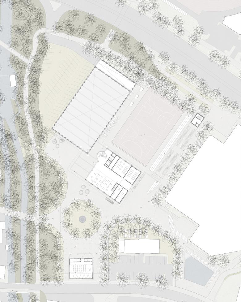 Erschliessung / Zwei Gebäudeteile gliedern das Volumen in einen Sockelbereich und ein darüber liegendes schwebendes Obergeschoss. Dazwischen entsteht eine grosszügig, gedeckte Pausenhalle, welche den zentralen Pausenplatz im Süden mit dem Allwetterplatz im Norden verbindet. Hier befinden sich der Haupteingang der Schule und ein separater Eingang für die Sporthalle. Eine Grosszügige zweigeschossige Eingangshalle empfängt die Besucher und schafft durch die Ausrichtung zum Platz einen Bezug zum Mehrzweckraum in der umgebauten Remise. Von diesem zentralen Raum führt eine überbreite Wendeltreppe zu den verschiedenen Nutzungen und verbindet alle Geschosse miteinander.