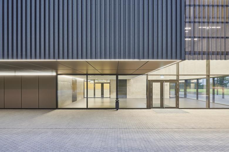 Der kubische Bau überzeugt schon von Weitem durch seine Schlichtheit und zurückhaltende Eleganz: Mit einer Fassade aus perforiertem, feingliedrigem Trapezblech und umlaufenden Fensterbändern bildet die neue Sporthalle in Gerlingen einen beeindruckenden Auftakt zum „Breitwiesen Stadion“. Das Gebäude, das im Herbst 2022 durch Thoma. Lay. Buchler. Architekten fertiggestellt wurde, schließt unmittelbar an die bestehende Außensportanlage und den neuen, am Spielfeld entlanglaufenden „Sportlerboulevard“ an, der eine Verbindung zu den seitlichen Tribünen sowie zum angrenzenden Schulhof der nahegelegenen Schule schafft. Damit fügt sich die Halle harmonisch in die umliegende Natur sowie die Nachbarbebauung ein.