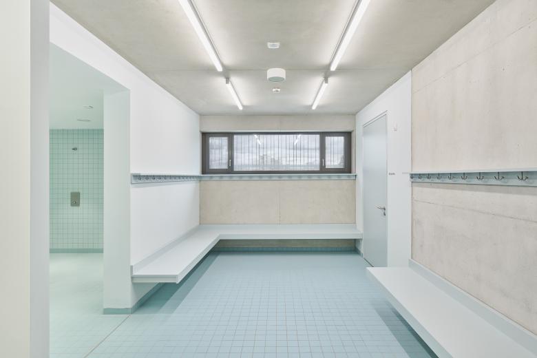 Vom westlich gelegenen und erweiterten Parkplatz mit altem (und neuem) Baumbestand führt der Weg zum Haupteingang der neuen Zweifachhalle über das „Sportlerforum“, einen als Treffpunkt geplanten Vorplatz. Breit angelegte Sitzstufenanlagen aus Beton laden hier zum Ausruhen und Verweilen ein – ein schattenspendender Baum wurde in eine holzverkleidete Sitzinsel integriert. Betritt man die Sporthalle über den überdachten Eingangsbereich, gelangt man in das bis ins Obergeschoss offene Foyer – Wände aus Sichtbeton verleihen dem Raum einen robusten und lebendigen Charakter. Von hier aus bietet sich auf der einen Seite durch eine Glastüre ein direkter Blick in die Sporthalle. Auf der anderen Seite gelangt man in den östlich liegenden verglasten Flurbereich. Durch die großen, bündig gesetzten Fensterflächen weitet sich der Blick auf die Außensportfelder, Sitzbänke im Innen- wie im Außenbereich bieten Platz zum Zuschauen oder Warten. Wie im gesamten Halleninneren kontrastieren hier wenige, ausgewählte Materialen: das helle Fichtenholz (hier: der Schließfächer), der anthrazitfarbene Gussasphalt und der Beton der Wände und der Treppen, die ins Obergeschoss führen.