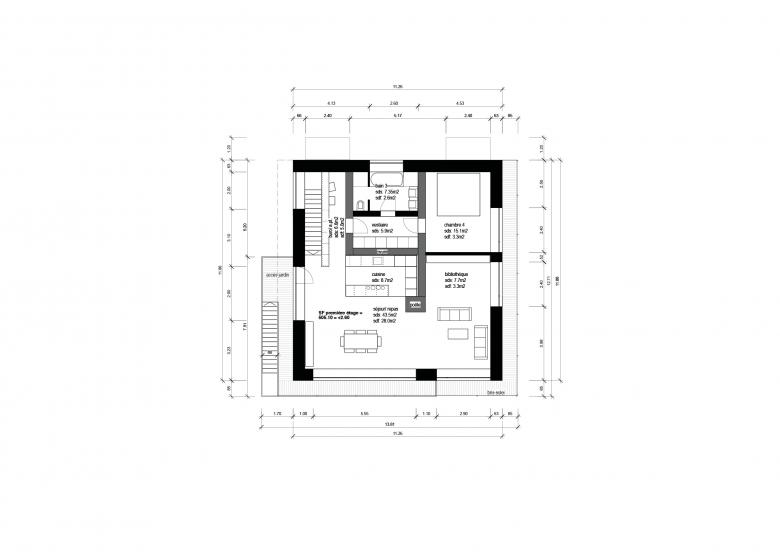Planung: Der Grundriss wurde für eine bessere Wärmeverteilung um den Grundofen geplant. Vorbereitungen für den Umbau zum Zweigenerationenhaus bereits getroffen.