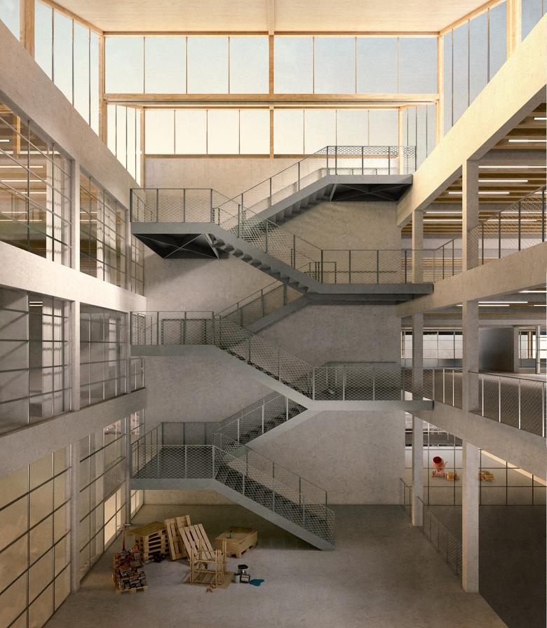 Die Fachhochschule Kiel ist ein Zusammenschluss mehrerer staatlicher Ingenieurschulen und Höheren Fachschulen und gehört neben Flensburg und Lübeck zu den drei ersten Fachhochschulen in Deutschland. Aufgrund der wachsenden Studierendenzahlen und des erweiterten Studienangebotes besteht der Bedarf, die letzten vorhandenen Reserveflächen auf dem Campus baulich weiterzuentwickeln. Im Eck- und Übergangsbereich zwischen der heterogenen bebauten Campusfläche und den Industrieflächen im Übergang zur Hafenkante soll ein Neubau für die Studiengänge Bauwesen und Architektur entstehen. Zielvorstellung der Nutzer*innen ist ein möglichst flexibel nutzbares und zukunftsfähiges Konzept aus kommunikationsfördernden, anpassungsfähigen und variabel nutzbaren Lehr-, Lern-, und Arbeitswelten das gleichzeitig hohe nachhaltige Qualitätsstandards erfüllt. Der Entwurf von DFZ reagiert darauf mit einer vielfältig bespielbaren Fassadenkonstruktion sowie der Begrünung von Dach und Fassaden, die u.a. für eine Verbesserung des Mikroklimas, der Reduktion von Feinstaub sowie der O2-Produktion im Zusammenspiel mit der CO2-Bindung sorgt, Grünflächenverluste werden ausgeglichen und die Biodiversität gefördert. Das Regenwasser der Dachflächen wird in Zisternen zwischengespeichert und dient der Bewässerung der Grünflächen, des Gründaches und der Fassaden. Die Pergola-Konstruktion oberhalb des Daches trägt Photovoltaik-Elemente zur Eigenstromerzeugung für die Anlagentechnik und führt damit zu einer deutlichen Unterschreitung des Gebäudeenergiegesetz. Die Kubatur vermittelt durch die Transformation von Hafenbautypologien und Industrieelementen zwischen den Strukturen des Industriehafens und den bestehenden Typologien der umgebenen Bebauung. Im Inneren gruppieren sich die Funktionseinheiten um einen zentralen Erschließungsraum, dessen räumlicher Charakter durch zwei Hof- bzw. Lufträume geprägt wird. Im geschlossenen Hof verbindet eine offene Treppe sämtliche Ebenen der Hochschule bis zur Dachterrasse. Die daran angrenzende Begegnungsflächen ermöglichen Synergieeffekte, so dass das zufällige Begegnen zu einer besonderen Erfahrung wird und zum interdisziplinären Austausch einlädt. Der Entwurf wurde gemeinsam mit G2 Landschaft umgesetzt.