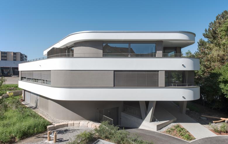 In direkter Nachbarschaft wurde das neue Mehrfamilienhaus erstellt. Es nimmt die Trapez-Form der Parzelle auf und fügt sich so geschmeidig in das bestehende Quartier. Mit dem vorspringenden ersten Obergeschoss, dem abgerundeten Grundriss und den hellen Brüstungen wirkt das Gebäude leicht und elegant. Der Neubau bietet zehn Wohnungen, die um einen zentralen Treppenhauskern angeordnet sind.