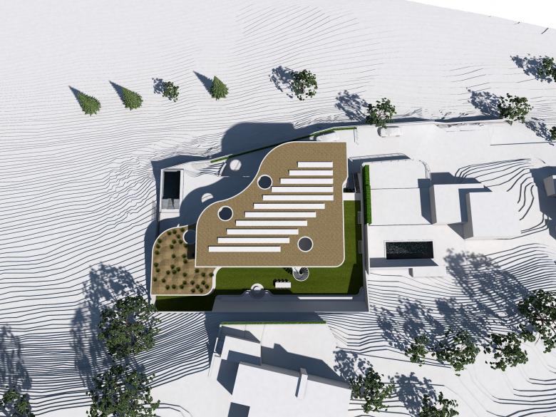 Vielfältige Durchblicke vereinen das Wohnerlebnis Innen und Aussen zu einem Ganzen. Im vom antiken Rom inspirierten gegen Süden angelegten atriumartigen, ruhigen, mit kleineren Bäumen beschatteten Sinnesgarten, erfreuen die Blumen- und Gewürzterrassen durch ihre Farben und ihre Düfte das Auge, die Nase und den Gaumen. Das mit einem geschwungenen, weit auskragenden Vordach überdachte Promenadendeck schlängelt sich entlang der Fassade und ermöglicht so den geschützten Aufenthalt in verschiedenen überdachten Bereichen im Aussenraum. Einzelne kreis-runde grosse Öffnungen spenden Licht und erzeugen interessante Lichtspiele.
