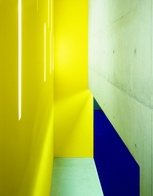 - Gegen die Schule mit Schulhof liegt selbstbewusst und ohne Einblick vom Polizeiposten die Eingangsloggia des Jugendtreffs. Die Betonung des Eingangs entschärft die geforderte unterirdische Lage und der Hallencharakter des Abgangs wertet den unterirdischen Raum zum öffentlichen Ort auf. Grosse aufklappbare Türen lassen den Vorbau am Platzbereich der Kirchstrasse zum Eingangs-, Übergangs- und Treffraum für die Jugendlichen werden.