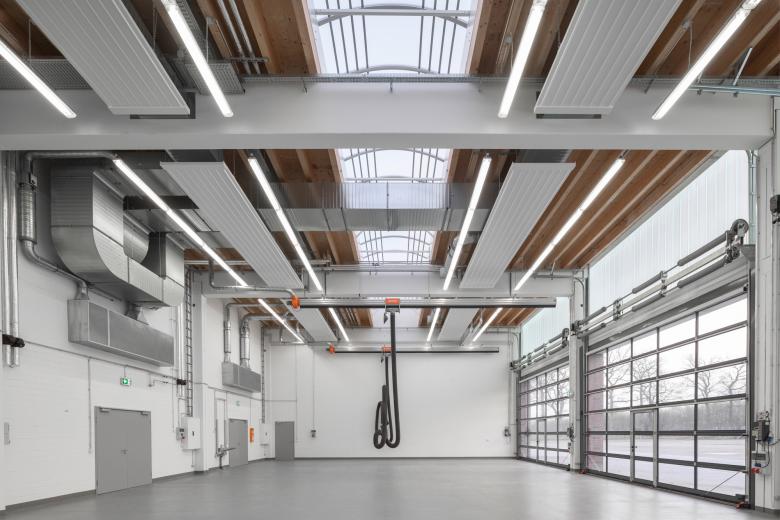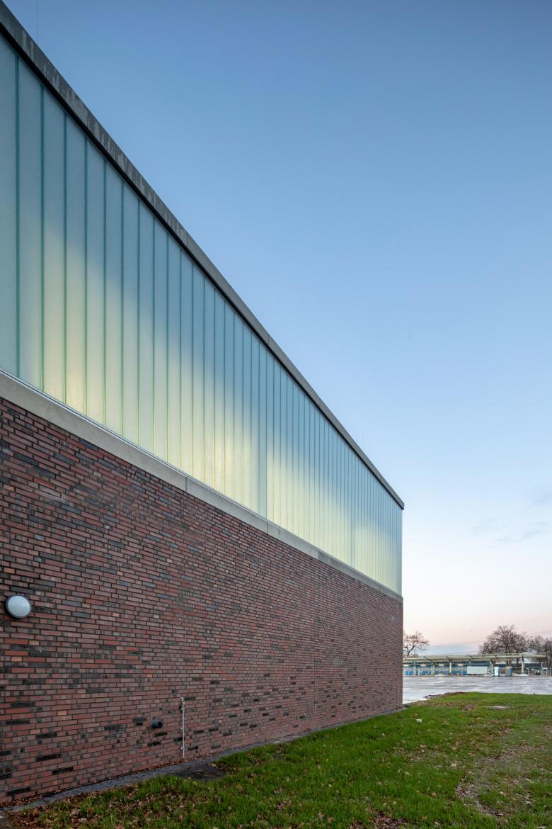 Die Werkhalle, bestehend aus einer Halle und einem angrenzenden Büro- und Sozial-trakt, ist eine Massivbaukonstruktion mit einem Flachdach und einer Klinkerfassade. Die Haupteingänge zeichnen sich an den Stirnseiten als eingerückter und überdachter Außenbereich ab. Im Hallenbereich wird die Strukturglasfassade von einer Sichtbetonattika eingefasst.