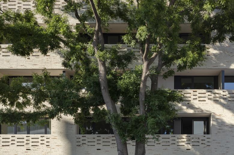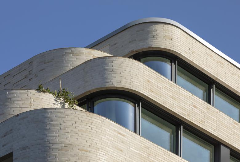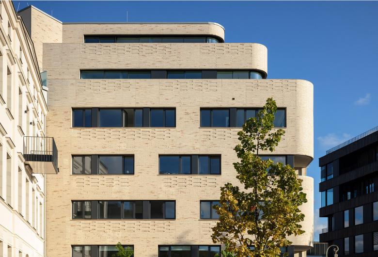 Die Materialität zeichnet sich durch edle und natürliche Oberflächen wie heller Ziegel, Holz und Sichtbeton aus. Gemeinsam mit dem ebenfalls zum Vorhaben gehörenden Altbau entsteht rückwärtig ein attraktiver ruhiger Wohnhof mit privaten Terrassen und begrünten Gemeinschaftsflächen.