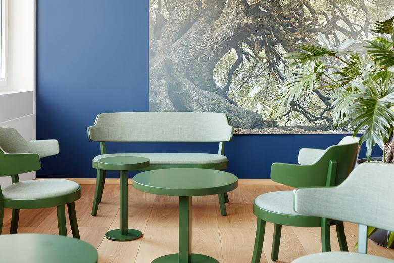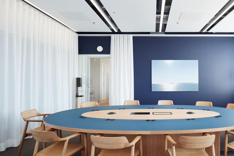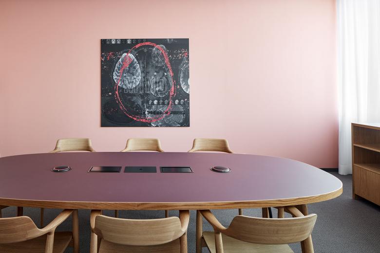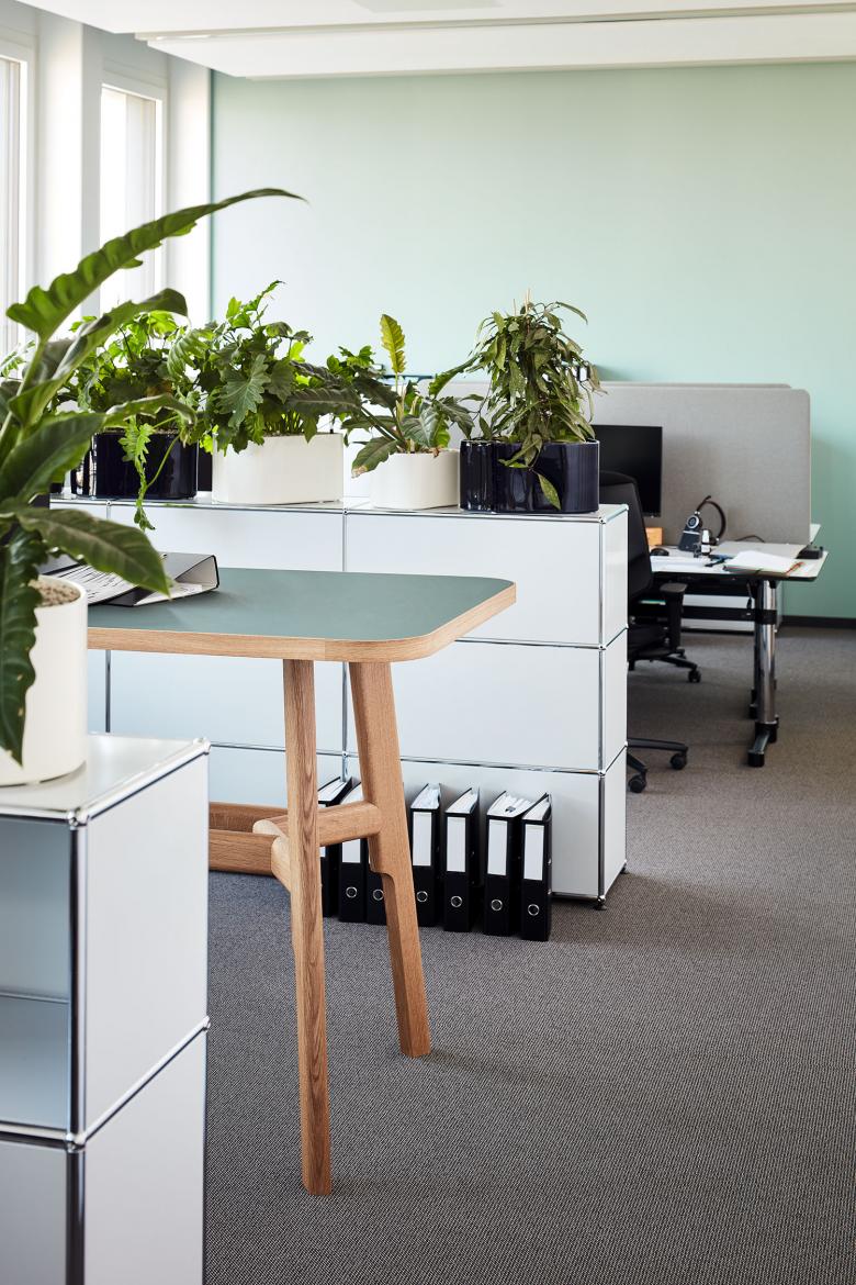 Ein Ort für konzentriertes Arbeiten, wo Kommunikation nach innen wie nach aussen störungsfrei gelingt und wo eine anregendes und kunstaffines Klima herrscht. Die lichtdurchfluteten Räume bieten Offenheit und Weite dank Glas- anstelle von Gipswänden. Gleichzeitig ist für Diskretion und Intimität gesorgt: Büros und Sitzungszimmer lassen sich bei Bedarf mit Akustikvorhängen abgrenzen, für Gespräche zu zweit stehen Bubbles mit unterschiedlicher Möblierung zur Verfügung. Tisca-Teppiche unterstreichen zusätzlich die angenehme Atmosphäre. Farblich wurden Empfang und Durchgangsbereiche in zurückhaltenden, hellen Tönen gehalten, während in den Meeting-Räumen charaktervolle Farben Behaglichkeit stiften. Die jeweiligen Farbtöne finden ihre Entsprechung in den Linoleumbelägen der von uns entworfenen Konferenztische. Audio-Video-Installationen sind so gut wie unsichtbar, Grossbildschirme verschwinden auf Knopfdruck in den Sideboards. Die Einrichtung wird ergänzt durch angenehm zurückhaltende Stühle des japanischen Herstellers Maruni. In der firmeneigenen Cafeteria gibt’s eine Coffee Lounge mit Seley Mobiliar von Horgenglarus.
