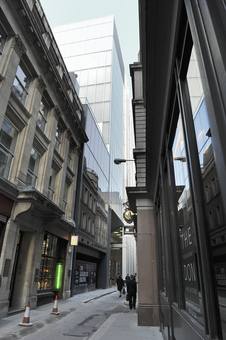 The central cube has a distinctive repeated pattern of structural steel columns embedded in the façade. At street level, the entire cube is lifted to create generous pedestrian access to the tall glass lobby and a covered forecourt that opens a visual passage to St. Stephen's Walbrook and its churchyard - creating a surprising moment of transparency in the otherwise constrained opacity of the medieval streetscape.
