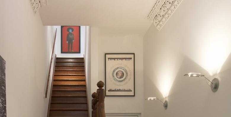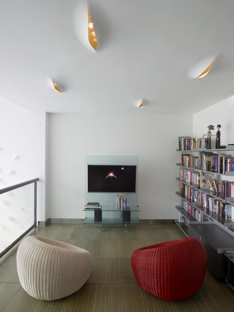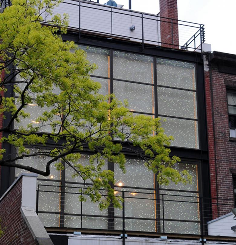 Die Fensterfront ist mit speziellen Glasplatten konstruiert, in die unzählige weiße LEDs eingelassen sind. Leiterbahnen sind nicht zu sehen. Für die Grundbeleuchtung kommen Schlitz Up zum Einsatz, teilweise innen gelb lackiert. Den Eingangsbereich beleuchten zwei Wandering Finger Wall.