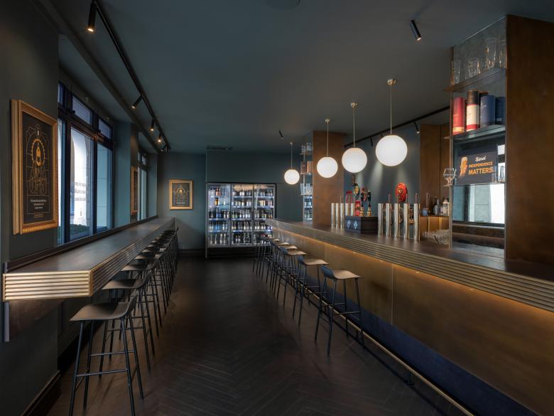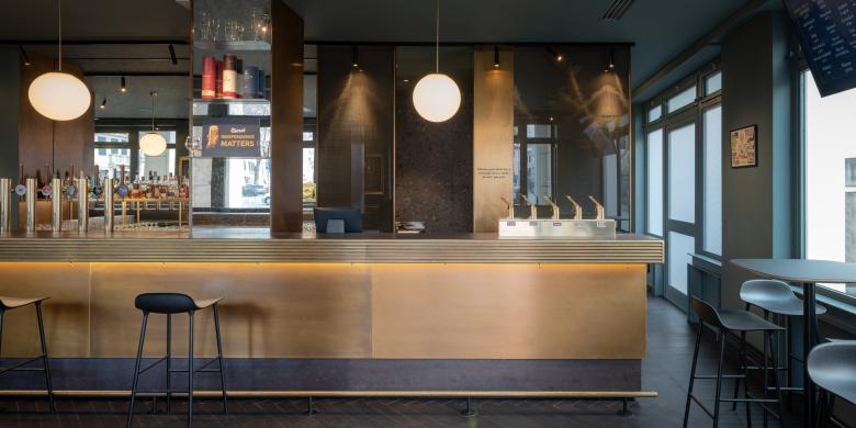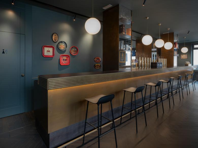 L'atmosfera elegante e rilassata al contempo crea uno spazio intimo dato dalla combinazione di materiali, textures e luce calibrata, componenti essenziali per un'esperienza immersiva nel mondo della birra artigianale.