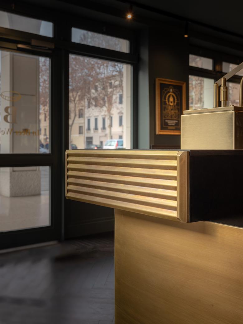 L'ottone viene utilizzato nel rivestimento dei pilastri centrali, nella modanatura plissettata dei banconi, nelle spine della birra e in altri elementi costituenti arredi e profili. A questo vengono poi affiancati specchi dal sapore anticato e vetri retroverniciati con una rete bronzata all'interno.