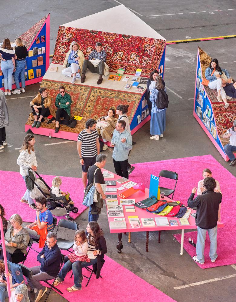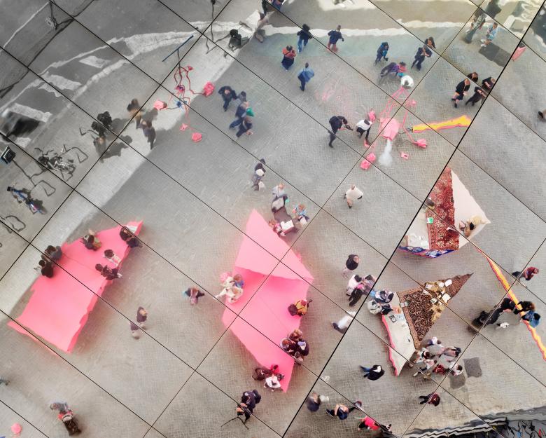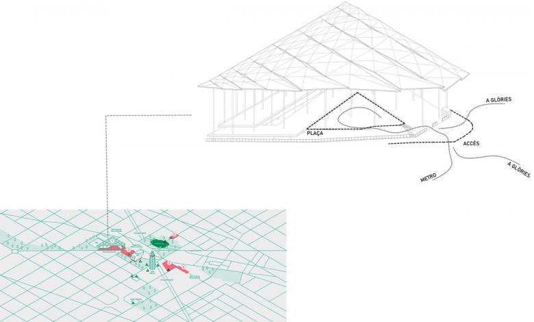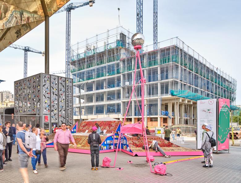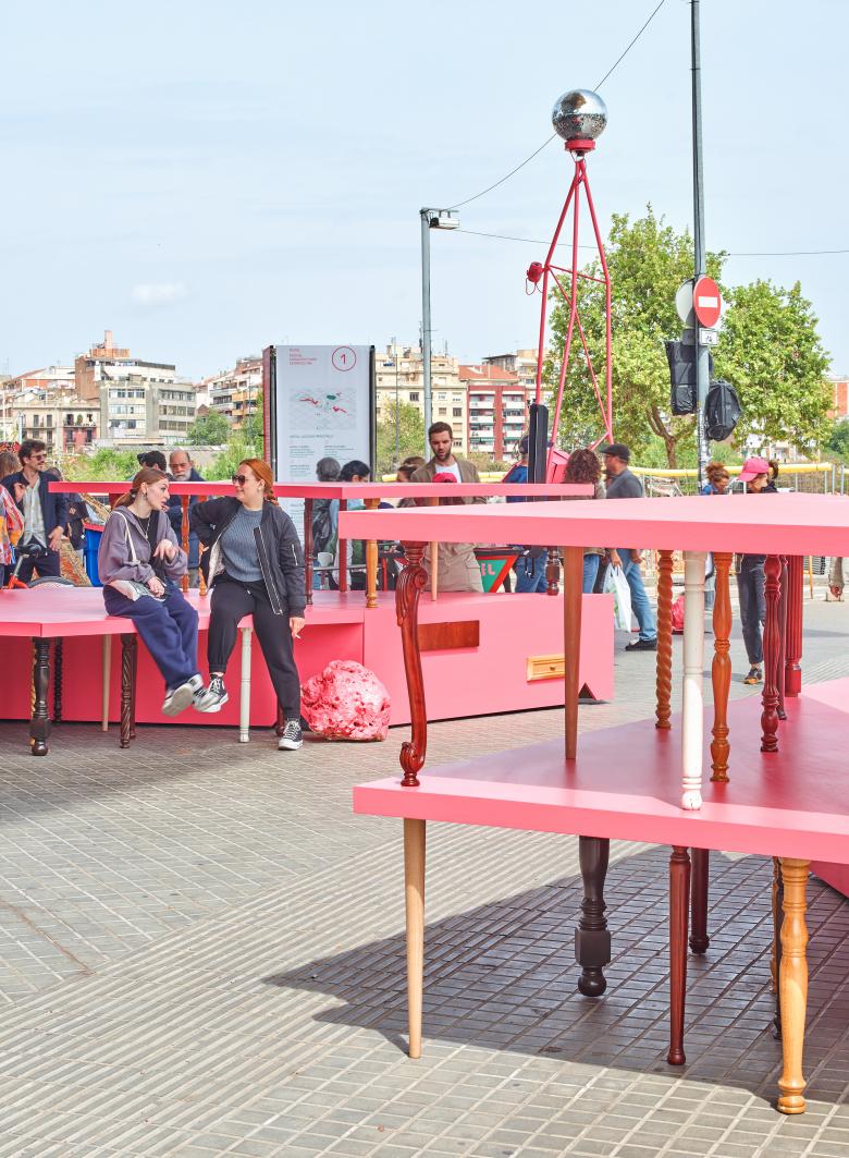 Con el objetivo de activar nuevas posibilidades de debate democrático y horizontal más allá de la lógica del mercado, el proyecto combina conjuntos de mobiliario de color rosa intenso —que evocan la geometría triangular de la cubierta de los Encants— con tres estructuras esbeltas, ligeras y atmosféricas. Junto con dos elementos adicionales, estos cinco componentes se abren, se cierran y se desplazan, evocando los artefactos surrealistas del Jardín de las Delicias y transformando el lugar en un entorno participativo y sugestivo que invita a la exploración, al encuentro y al intercambio colectivo.