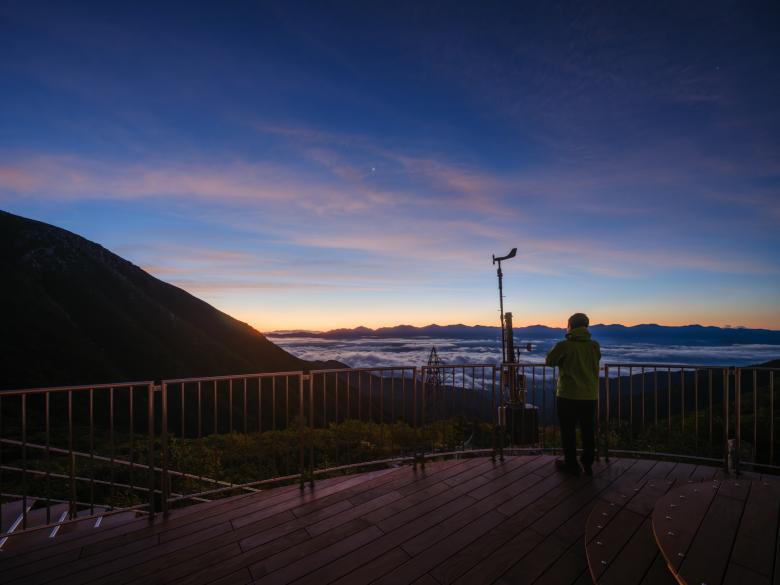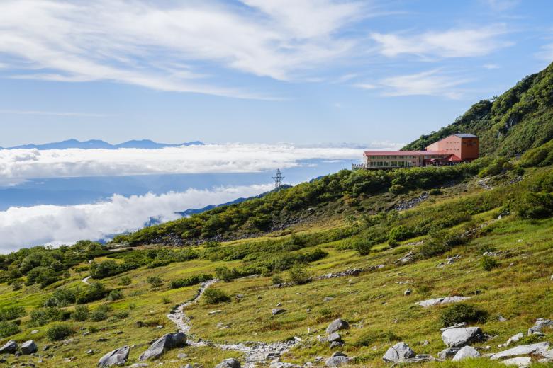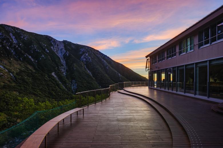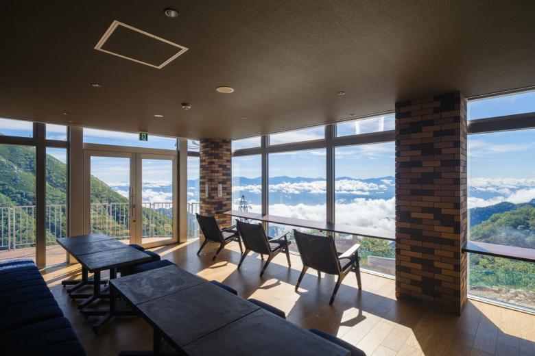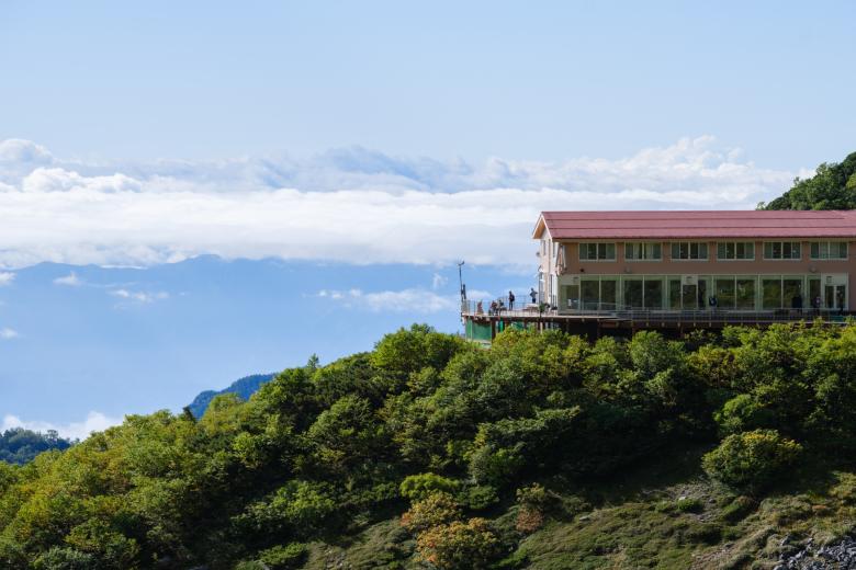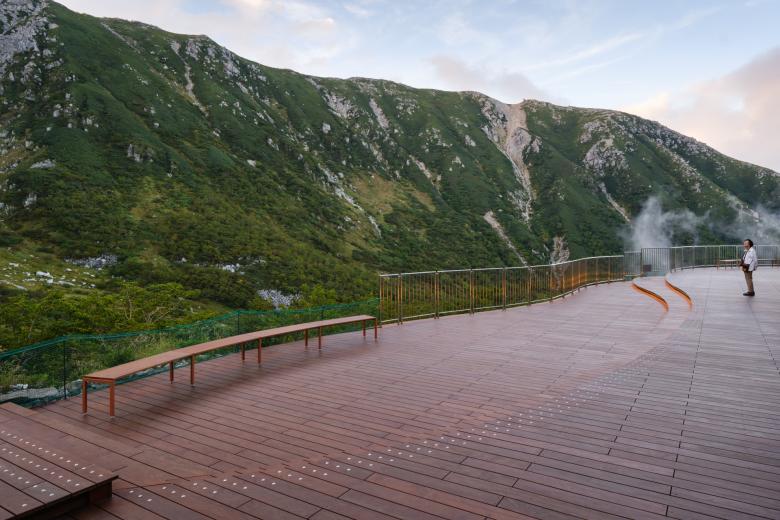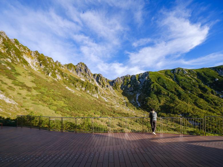 駒ヶ岳の標高2612mに位置するロープウェイ駅とホテルに新たに増築した展望テラス。千畳敷カールを望む場を提供することが目的のため、テラスはオブジェクト化せずに単に平坦なプレートとし、保護の対象となっているハイ松の植生をトレースする平面形状となっている。