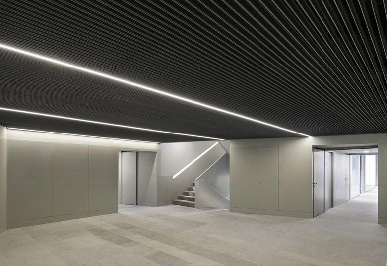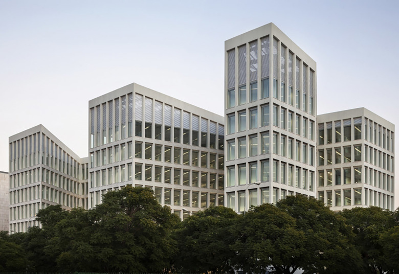 Una crujía homogénea de 12.40 metros, sin pilares intermedios, idónea para uso administrativo, da forma a los cuerpos edificatorios de ocho plantas que se entrelazan, generando una figura singular. La edificación, al prolongarse hasta el perímetro del solar, define las alineaciones de las calles sin perjudicar a los edificios vecinos.