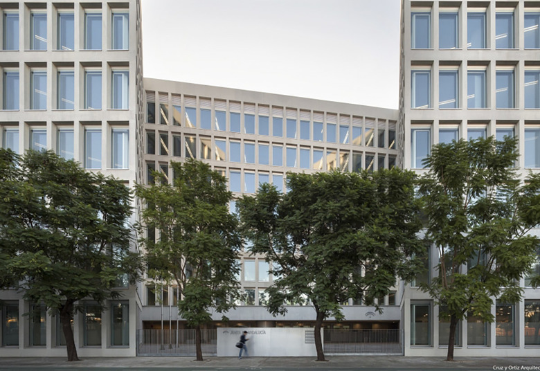 El largo perímetro de iluminación constituye una fachada modulada y continua que, al plegarse, genera espacios abiertos y arbolados con masas de cítricos. Sobre las ocho plantas, una cubierta inclinada proporciona espacio para las instalaciones. El perfil y la volumetría cambiante deben dotar al edificio de la singularidad adecuada a su carácter público.