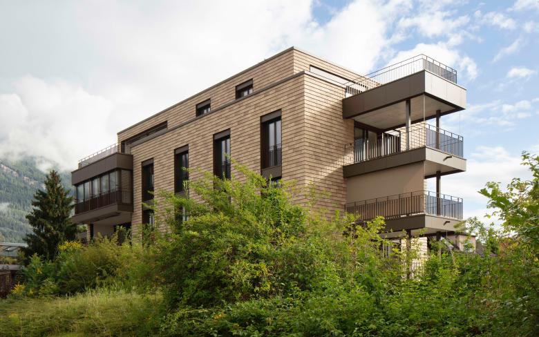 Das Gelände einer ehemaligen Malerwerkstatt in unmittelbarer Nähe zum Bahnhof Chur nutzt Ritter Schumacher Architektur zur baulich hochwertigen Verdichtung des Quartiers. Das längliche Volumen des Neubaus fügt sich unprätentiös in die gewachsene Umgebung ein. Sieben barrierefreie Wohnungen mit grosszügigen Fenstern und Süd- oder Westbalkonen finden im Gebäude Platz. Die Architektinnen und Architekten haben eine moderne Ausdrucksform gewählt, die dennoch angemessen auf den Bestand reagiert. Die mit Urban T Frederiksberg eingedeckte Fassade lässt das Mehrfamilienhaus weniger wuchtig erscheinen, die reduzierte Formsprache wird um einen spielerischen Aspekt erweitert. Die Materialisierung der Fassade, den Anschluss an das Fernwärmenetz und eine Photovoltaikanlage vermitteln eine konsequente Haltung zu nachhaltigem Bauen.