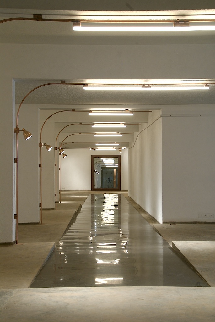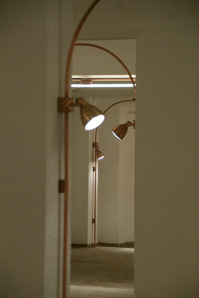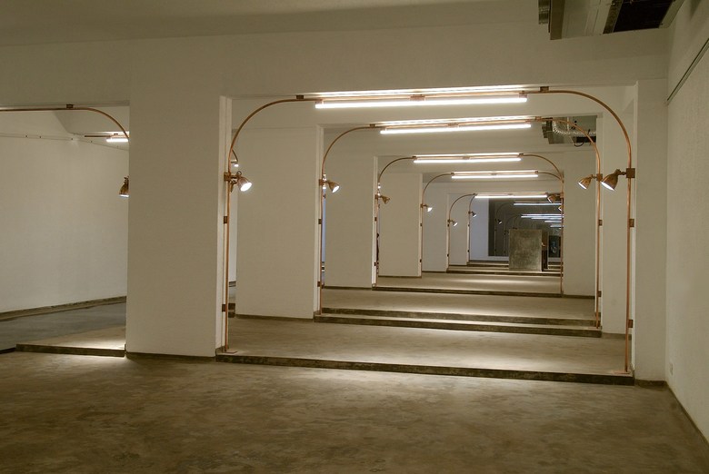 Product lighting and architectural intervention were both generators of this scheme. Since the basement was peppered with columns at regular intervals, the extreme rectangularity of the portals - led to the invention of a superimposed set of portals in the form of arches which served as exposed wire conduits as well as light fixtures for "ambient as well as accent lighting." "Copper" due to its Faradays coil connotation and easy availability in tube format (workability) became the material of choice. These Arches were juxtaposed with the structural portals, creating the repetitive symmetry, converting the dull limited space into infinity.