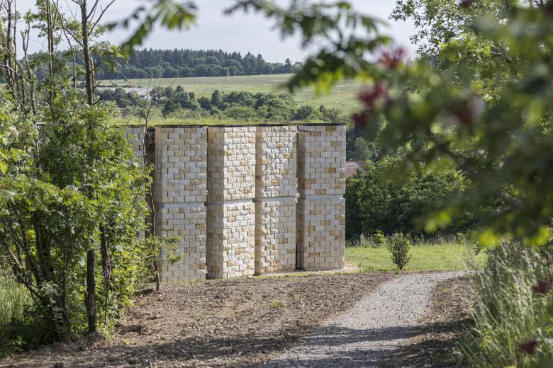 Bottom-up-Prozess, initiiert von den lokalen Bewohnern, verkörpert dieses Gebäude eine kollektive Arbeit, einen besonderen Ort für selbstwirksame Erfahrungen und den Gemeinschaftsgeist zu schaffen. Auf einem Hügel thronen zwölf 6 Meter hohe Sandsteinpfeiler, die einen offenen Raum bilden, dessen Inneres wie zwei schützende Hände gestaltet ist und einen einladenden Ort zur Reflexion bietet - sowohl mit sich selbst als auch im Austausch mit anderen und