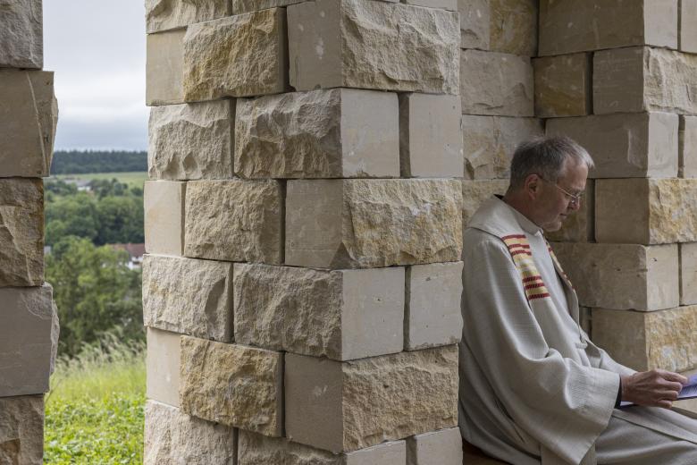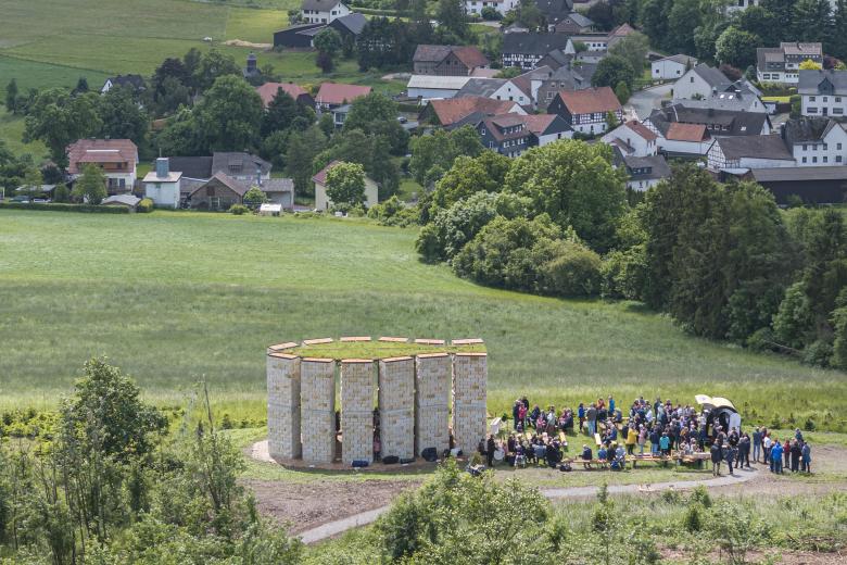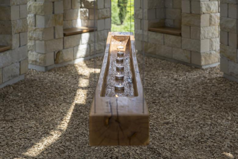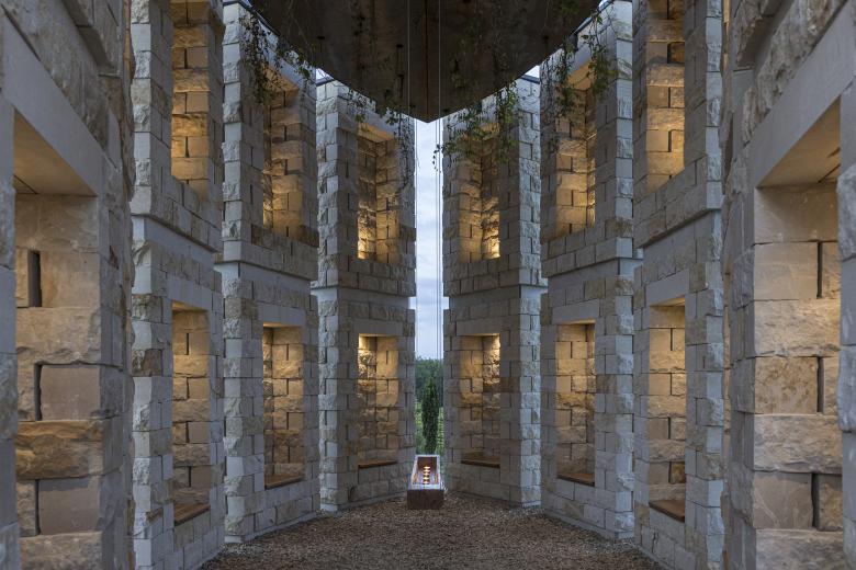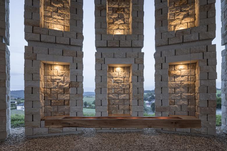 Perched on a hill, twelve 6 meter tall sandstone pillars form an open space with an interior shaped like two protective hands, providing a welcoming area for reflection both individually and collectively, with others and with nature. Communicative seats encourage face to face interaction, fostering dialogue and contemplation. The roof with hanging plants blurs the boundaries between architecture and nature, while the wood chip-covered floor symbolizes a seamless transition from the interior to the surrounding landscape.