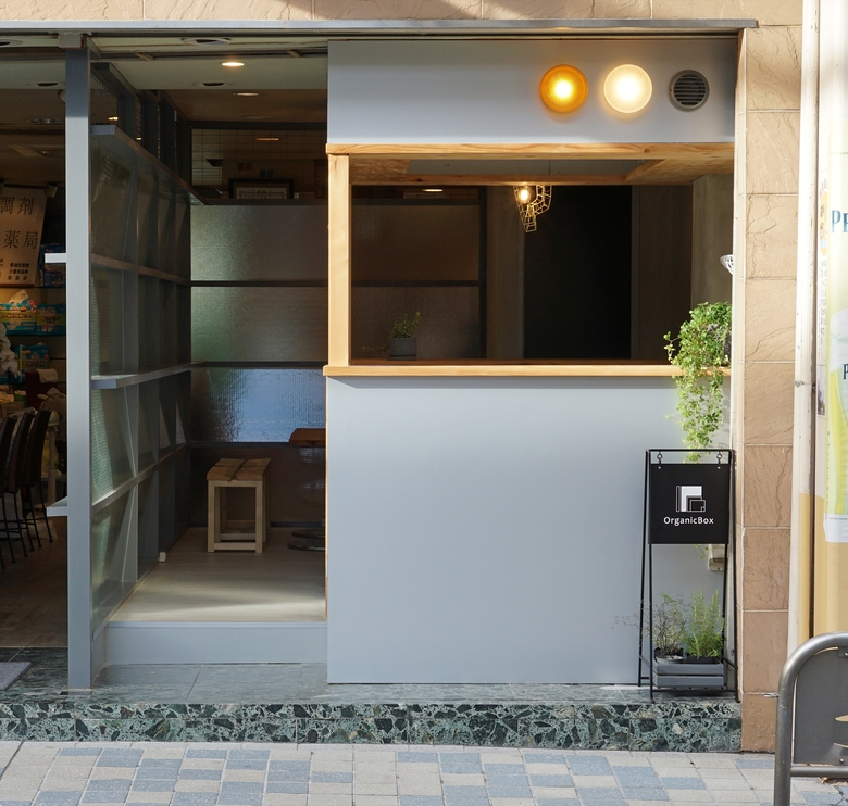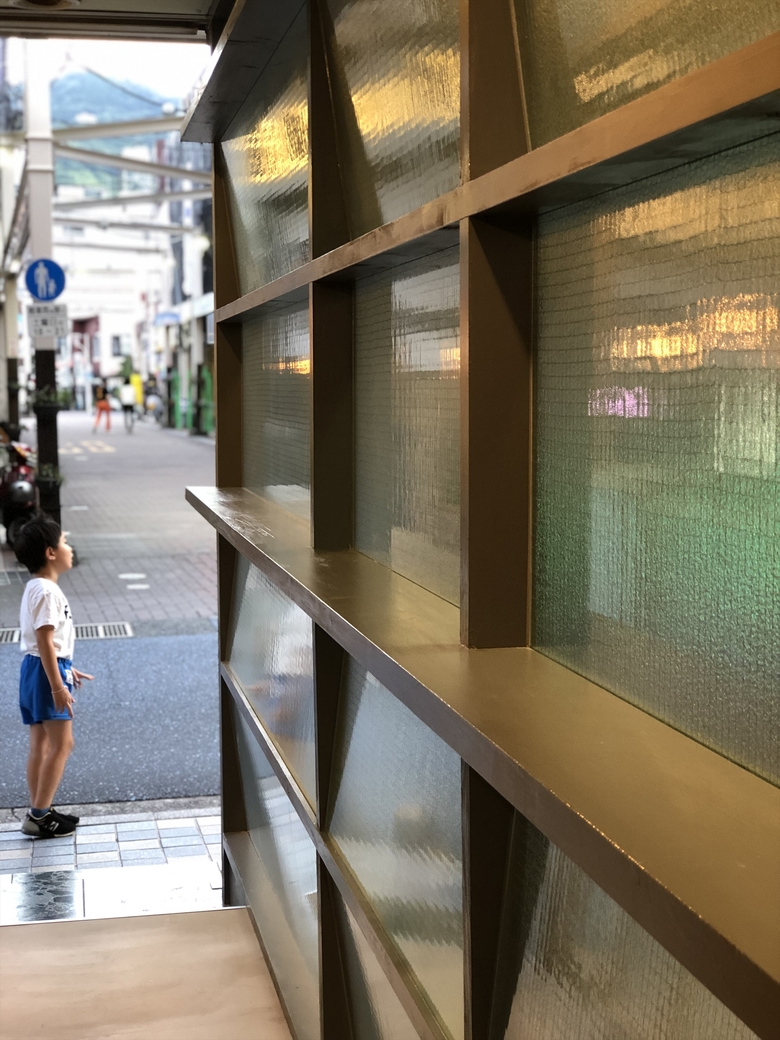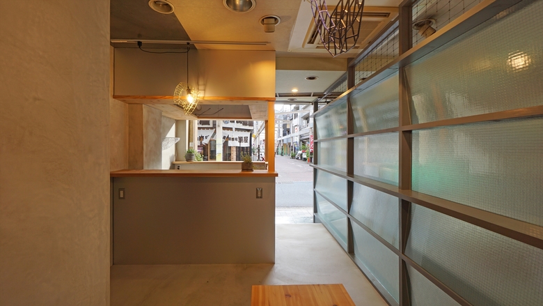 静岡県熱海市の海へと繋がる熱海銀座通り商店街に面するオーガニックカフェ。間口が5mほどの既存店舗は、熱海の芸者さんが通った小間物屋(椿油や白粉等を扱う)がルーツの調剤薬局。今回はその1/4ほど(間口2.5mx奥行き5m)をオーガニックカフェへと改装した。通りに面した店頭販売を主としているが、厨房裏のカウンター席、テーブル席、長手方向の木フレームを利用したロングカウンターと様々な客席を用意。薬局との仕切りには網入り型板ガラス霞クロスを用いることで互いの光と気配を感じることができる。またこのガラスは18cm幅の横桟毎に、湯けむりが立ち上るが如く垂直方向の角度を振ることで、薬局側では商品棚のスペース、カフェ側ではカウンタースペースをつくりだしている。この角度の異なるガラスには、カフェの照明の反射光はもちろんのこと、薬局側の様々なカラーの化粧品サインがぼやけて透けたり、通りを走る車のライトやアーケードの光が交差する。単層の仕切りでありながら湯けむりのような多層で複雑なひろがりをつくりだしている。コストを抑えるために天井には極力手を加えないこととした。よって既存の空調機や照明を利用するために仕切り壁の上部は金網となっている。厨房内の壁に掛けられた雲のような棚や照明フードは茅ケ崎在住の彫刻家である岡田健太郎氏によるもので、線による印象的な陰影を空間に与えている。厨房の壁はアルミで覆い、光る目玉を二つ通り側に設けることで商店街の賑わいに参加している。