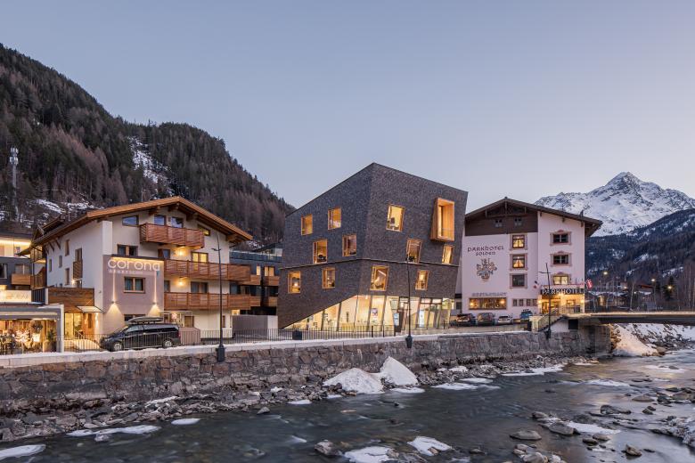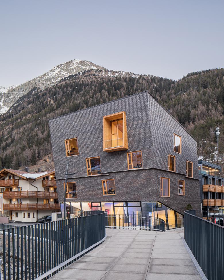 Dynamisch lehnt sich die Form des neuen Gebäudes nach vorne, fasst somit formal den Vorplatz ein und schafft eine klare Prominenz an entsprechender Stelle. Gleichbedeutend der Werte von Ötztal Tourismus vertritt auch der Entwurf einzigartige Attraktivität.