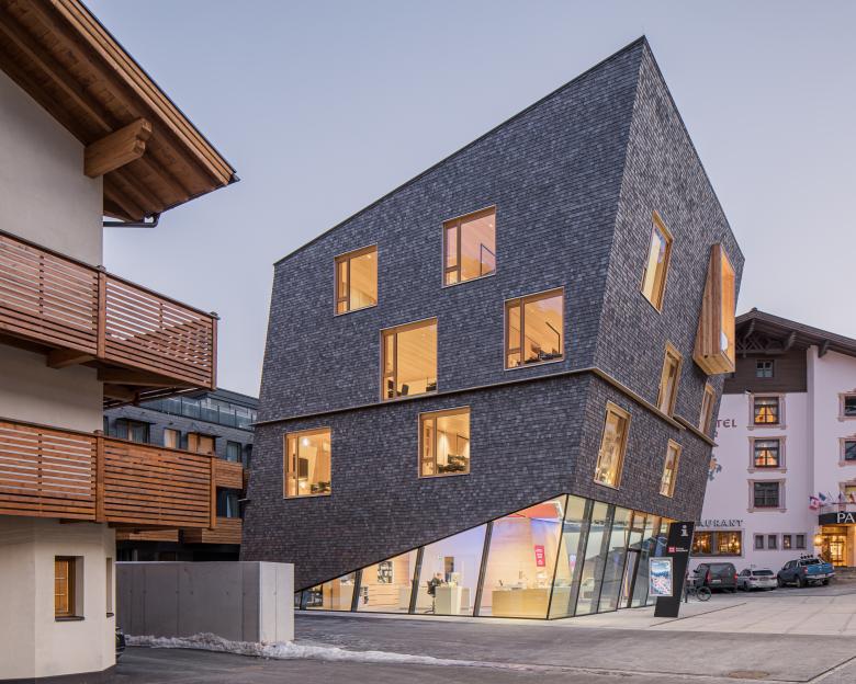 Die mit vorgegrauten Lärchenschindeln verkleidete Außenhaut, in Kombination mit raumhohen Holzfenster und einer offenen Glasfassade im Erdgeschoss lässt ein überaus prominentes Gesamtbild entstehen, das aus umliegenden Gebäuden herausragt.