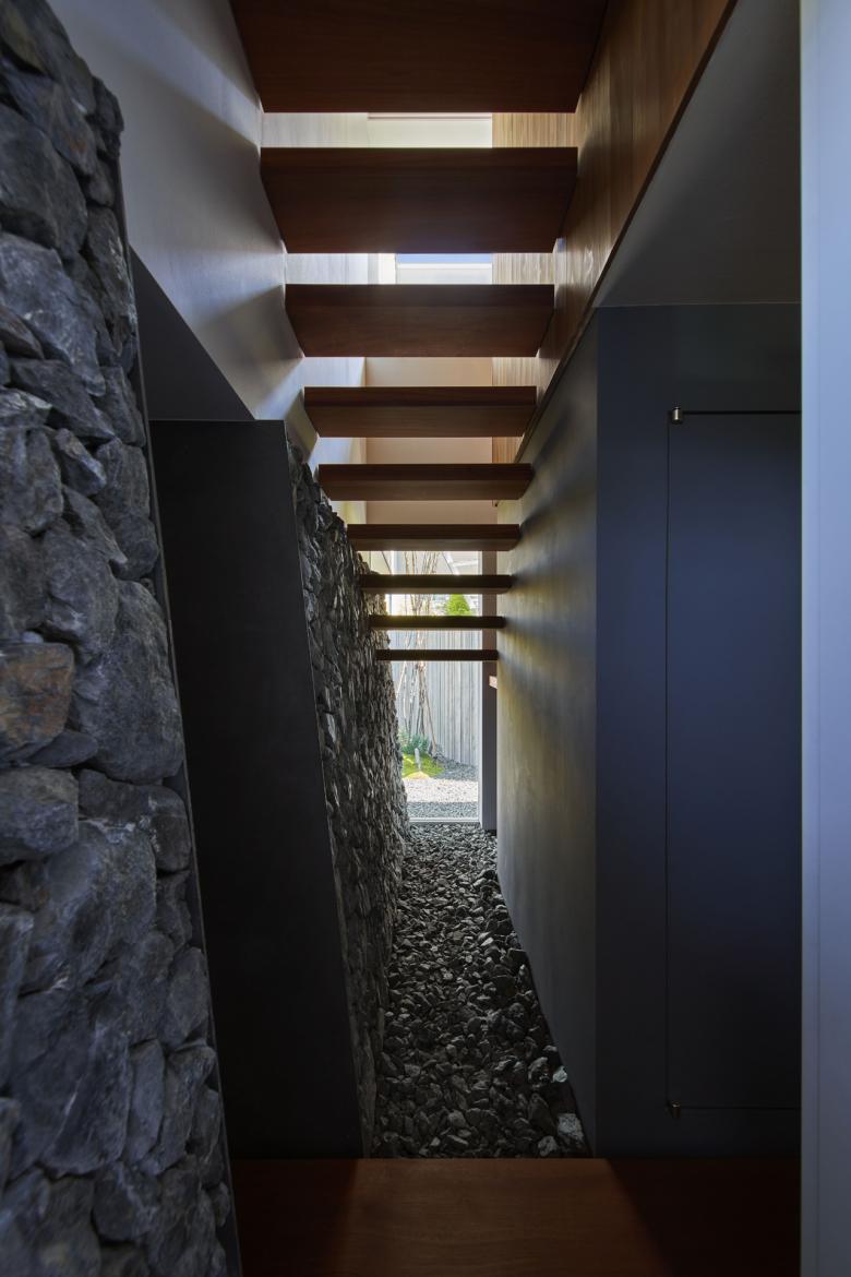 擁壁をインテリアとして取り込み、まるで地中にいるような感覚になる1階。浮き壁と堀り込まれた1階を眺めると、まるで浮遊してるような2階は空をより近くに感じられる。