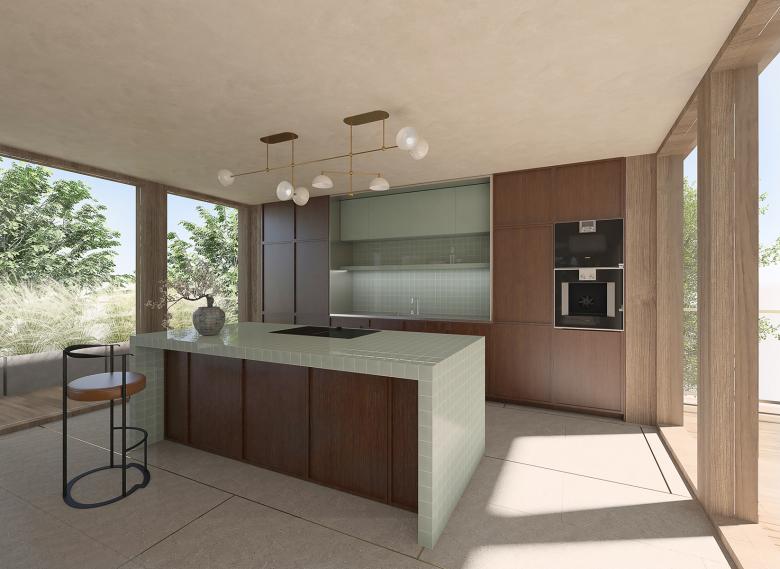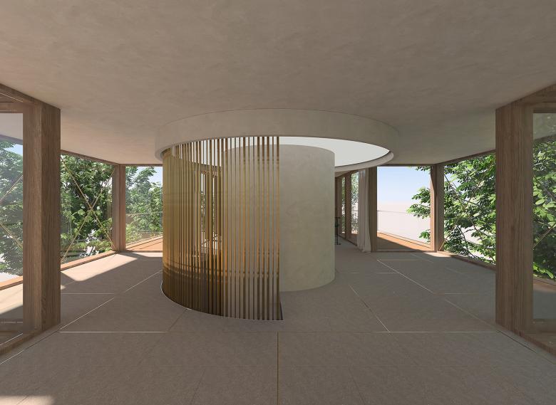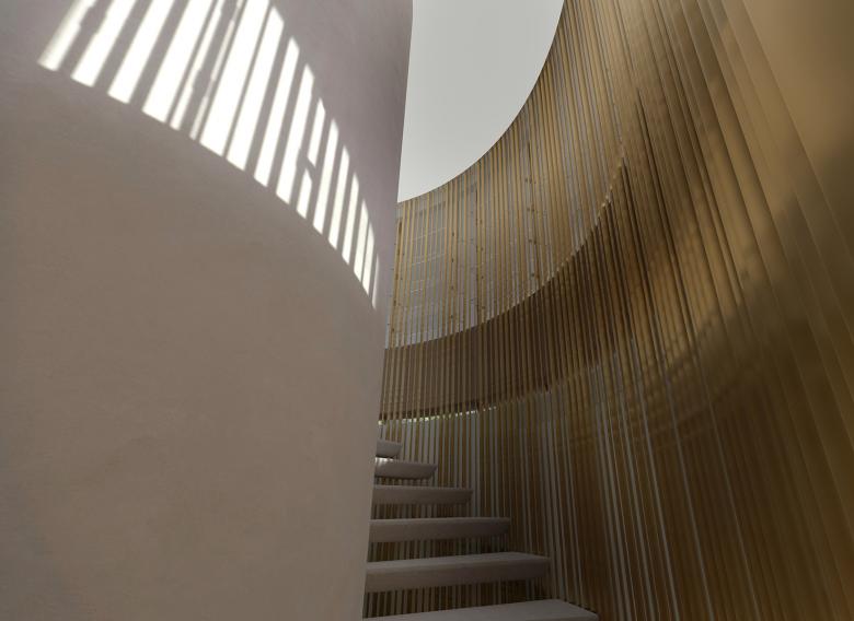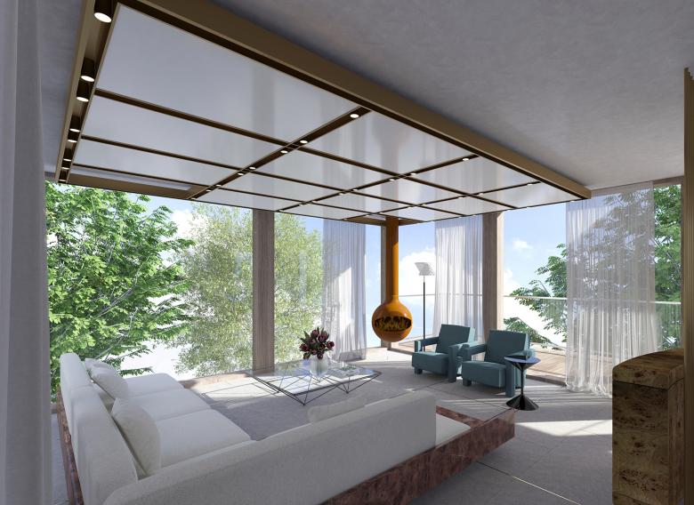 The project extends over three levels: the basement houses the essential supply and service rooms, while the main entrance and the private areas are spread over the first two floors. Finally, the centrepiece of the living space is located on the third floor: an expansive open room with a magnificent view of the lake, offering a perfect balance between connection to the outside world and private retreat. The central spiral staircase is an important architectural and design feature that elegantly connects the three floors. From here, the top-floor terrace offers breathtaking views of the lake – a moment of openness and serenity that contrasts with the more intimate spaces inside. The entrance level creates a strong connection to the outside by incorporating a stone floor inspired by the delicate lines of matt and soft tatami mats, creating a subtle rhythm throughout the villa. At the same time, brass inlays on the stone surface capture and reflect the light, bringing movement into the space, while the bamboo-inspired details in the brass rod of the staircase create an organic, natural rhythm as you ascend. The main focus of the project was to find a balance between opposites: calm and dynamism, perfection and imperfection, light and dark, softness and hardness. It is a space where the materiality, form and philosophy of the design come together to create an experience that is uniquely personal yet universally inspiring.