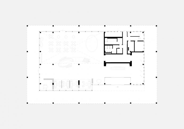 As uncomplicated and unpretentious as a piece of paper – that’s the canopy roof that defines the reception center in Bin Hai. The upswept corners are a feature of ancient Chinese buildings and were believed to be auspicious, alongside their function in deflecting rainwater. The diagonal beams of the center’s roof form a mesh that references a forest canopy, sheltering the glass pavilion beneath with dappled shade like the branches of a tree.