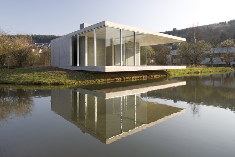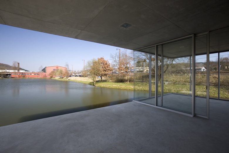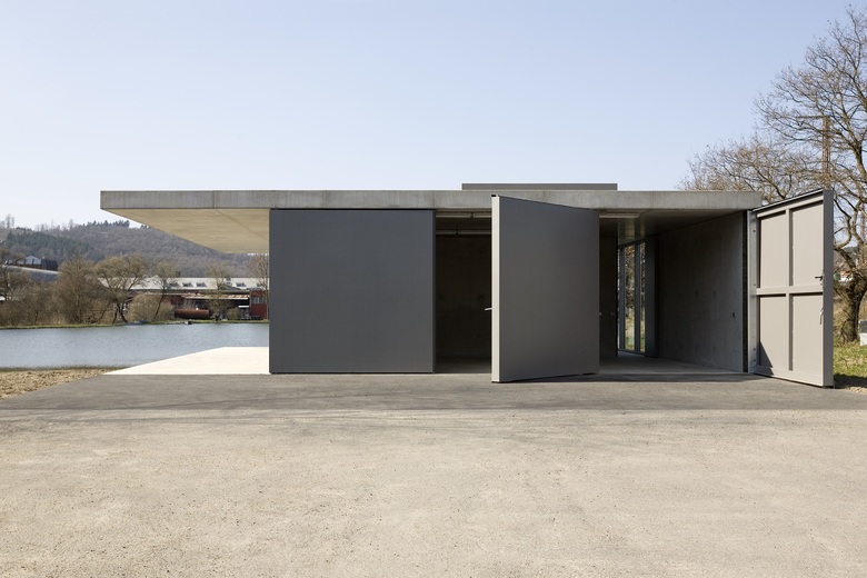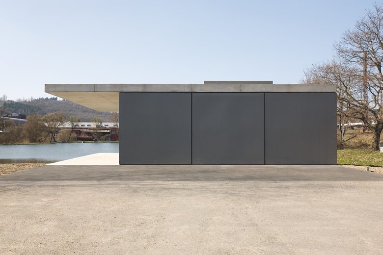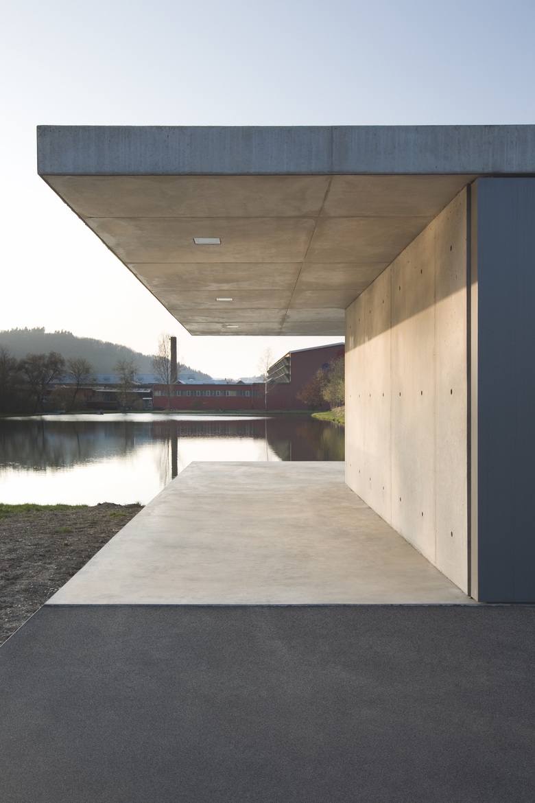 Der Pavillon befindet sich am Ufer eines Sees. Aus Sichtbeton erbaut, schwebt er über der Uferkante und Wasseroberfläche. Der Pavillon bietet Platz für drei Autos, das Angelmateriallager des Bauherrn und ein WC. Die Struktur des Sichtbetonbaus basiert auf einem genau definierten Schalungsraster.