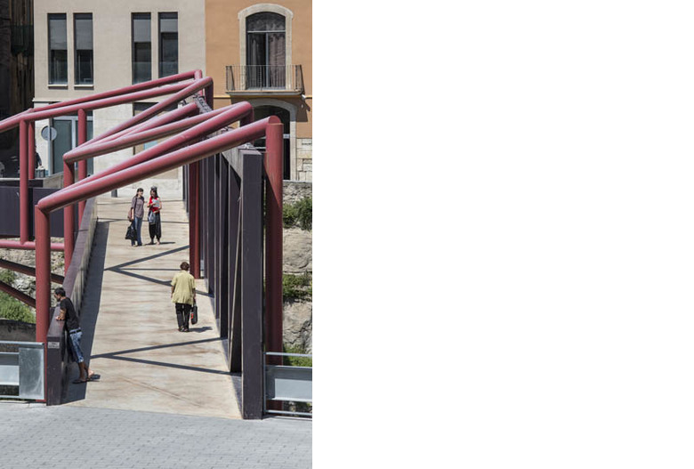 It is a basic operation of urban mobility with an enormous power of transformation since it unites two city districts that, although bordering one to each other, have been historically separated by a topographical barrier. The bridge connects the medieval city with the industrial area -traditionally located by the river- and Les Escodines neighborhood, across a gap of 50 meter, vanishing the physical and psychological isolation.
