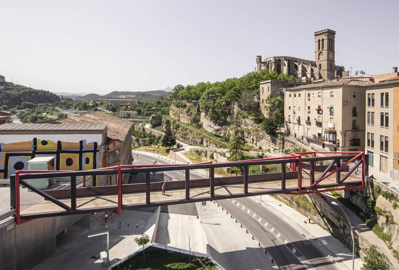 The pedestrian bridge over Sant Ignasi Road is a fundamental part of an ambitious urban revitalization plan for the center of Manresa, a city near Barcelona. The aim is to bring back the centrality and dynamism that the historical center used to have opening it to the rest of the city through new ways of access.