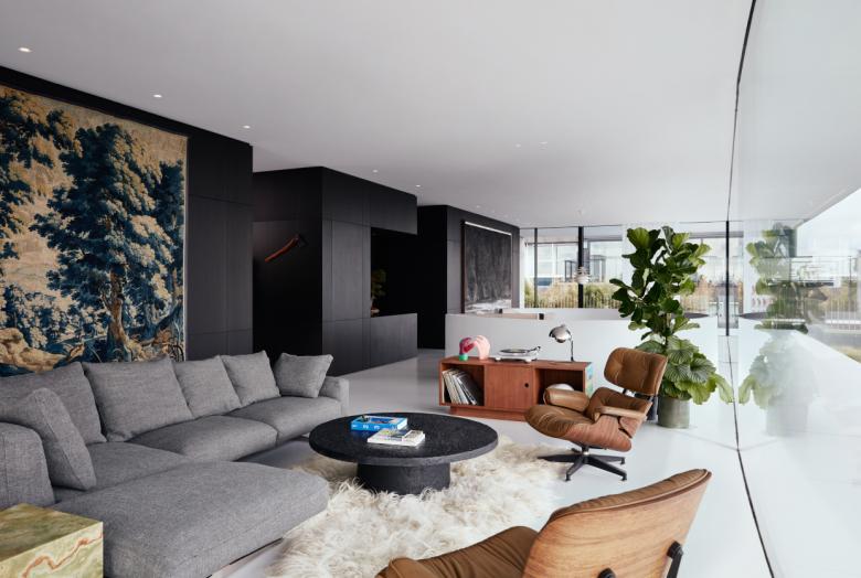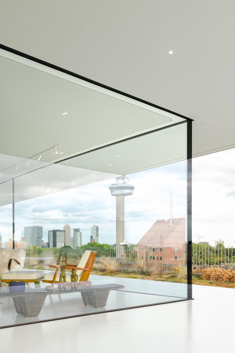 The two floors are linked by a generous, champagne-colored spiral staircase, via which visitors arrive in the living room, surrounded by glass and by jaw-dropping views of the river Maas and the city skyline. The penthouse façade is the largest load-bearing glass façade in north-west Europe. The roof rests on top of it, anchored by steel cables concealed in the joints between the glass sections. The glass is set at a slanting, rather than straight, angle for added strength. Outside the glass rectangle, a generous overhang provides shade and repeats the form of the patio below. Grey was chosen for these surfaces to avoid glare.
