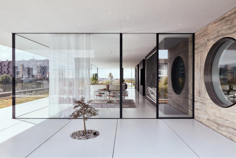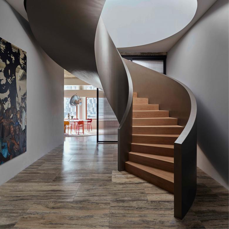 Behind the glass rectangle, a more closed volume presents a travertine façade to the outside world, while inside the spaces offer greater privacy and intimacy. The music room is lined in American walnut and features a large circular window with views over the harbor. The kitchen diner is executed in a sumptuous palette of mahogany wood, red travertine, matt gold resin and green serpentine stone. The master bedroom is crisply white, with the bathroom entirely covered in travertine. On the level below, in the original building, the three children’s rooms are treated as autonomous furniture objects in space and clad in American walnut. Organic materials like wood, stone, and leather plus slices of color – the pink glass wall next to the spiral staircase and the gold cabinets in the kitchen – add warmth to the interior. As a finishing touch, art is carefully curated throughout to create an integrated experience of space.