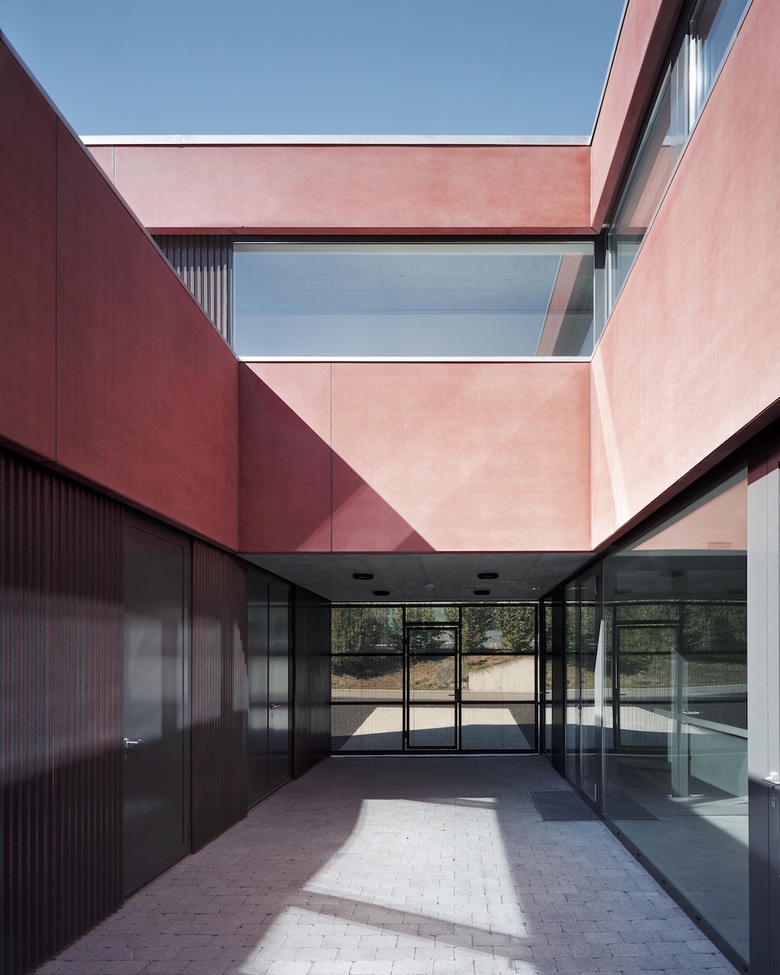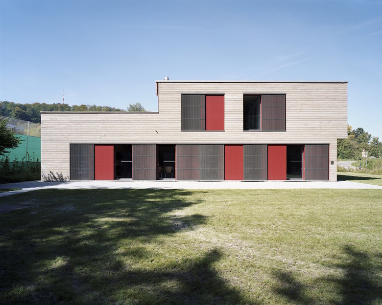 Der Neubau schafft in der etwas dispersen Umgebung einen Ort in sich selbst: Mit der fast quadratischen Grundform nimmt es neben dem benachbarten Clubhaus platz. Im Inneren bildet die Überlagerung des U-förmigen Erdgeschosses und des L-förmigen Obergeschosses einen eingelassenen Hof - ähnlich einem Patio. Zusammen mit der grosszügigen Terrasse im OG bilden sie die spielerischen Bühnen des Hauses.