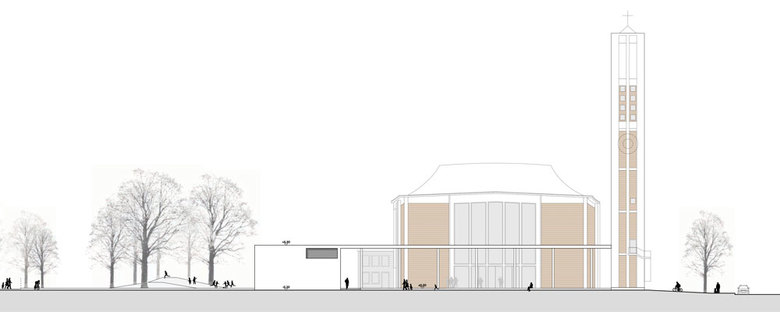 Konstruktion/Ökologie – Die angestrebte Architektursprache vermittelt den Eindruck einer unprätentiösen Einfachheit und Beständigkeit. Die umschließende Gebäudehülle aus einheitlichem Sichtziegelmauerwerk steht einerseits in der Tradition kirchlichen Bauens und ergänzt mit den kraftvollen Sichtbetonbauteilen der Arkade die bestehende Pfarrkirche. Auf Grund der sehr kompakten Bauweise mit geringer Hüllfläche, hochwertiger Wärmeisolation und guter Wärmespeichermasse kann ein energetisch zeitgemässes Projekt verwirklicht werden. Auf Grund der guten Ökobilanz wird ein Anschluss an das Münchner Fernwärmenetz empfohlen. Zur Warmwassererwärmung der Wohnbereiche kann eine ergänzende Solarthermieanlage angebracht werden. Eine hygienische Trinkwasserbereitung erfolgt über dezentrale Trinkwasserstationen.