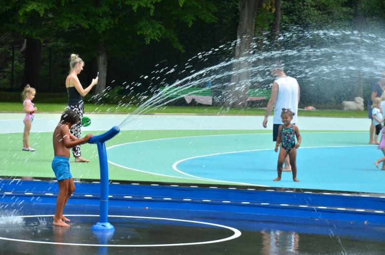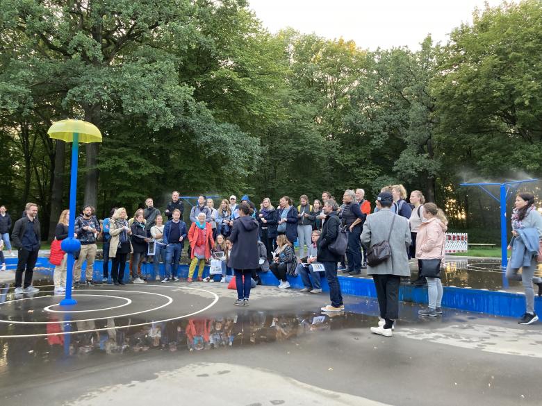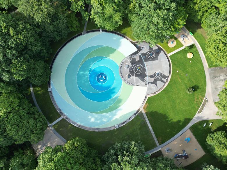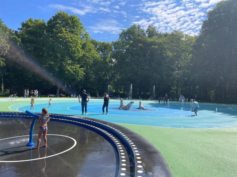 der Belag in EPDM in Blautönen belegt. In den Belag sind in Bögen Wasserdüsen eingelassen, die in unterschiedlichen Höhen, Formen und Zeitintervallen