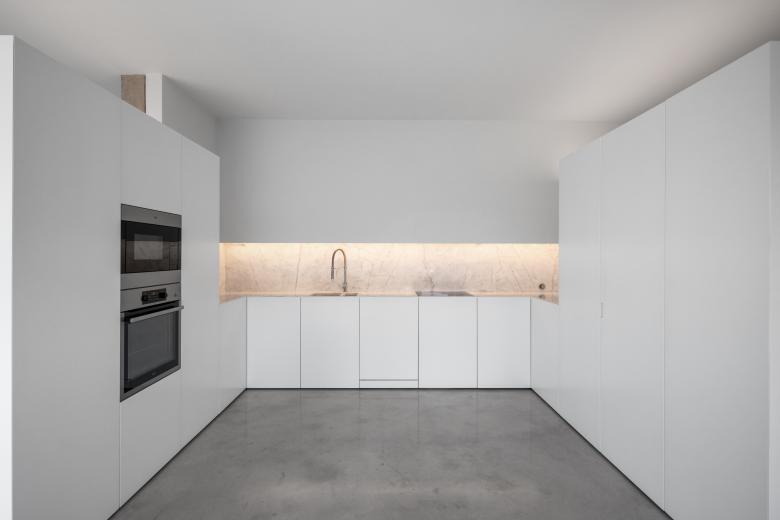 The social area comprises a living room and dining room, seamlessly connected to the kitchen and breakfast area. Kitchen furniture, has 2.1m of height, partially separate the common space and provide access to the pantry and laundry room.