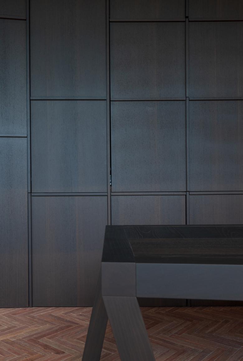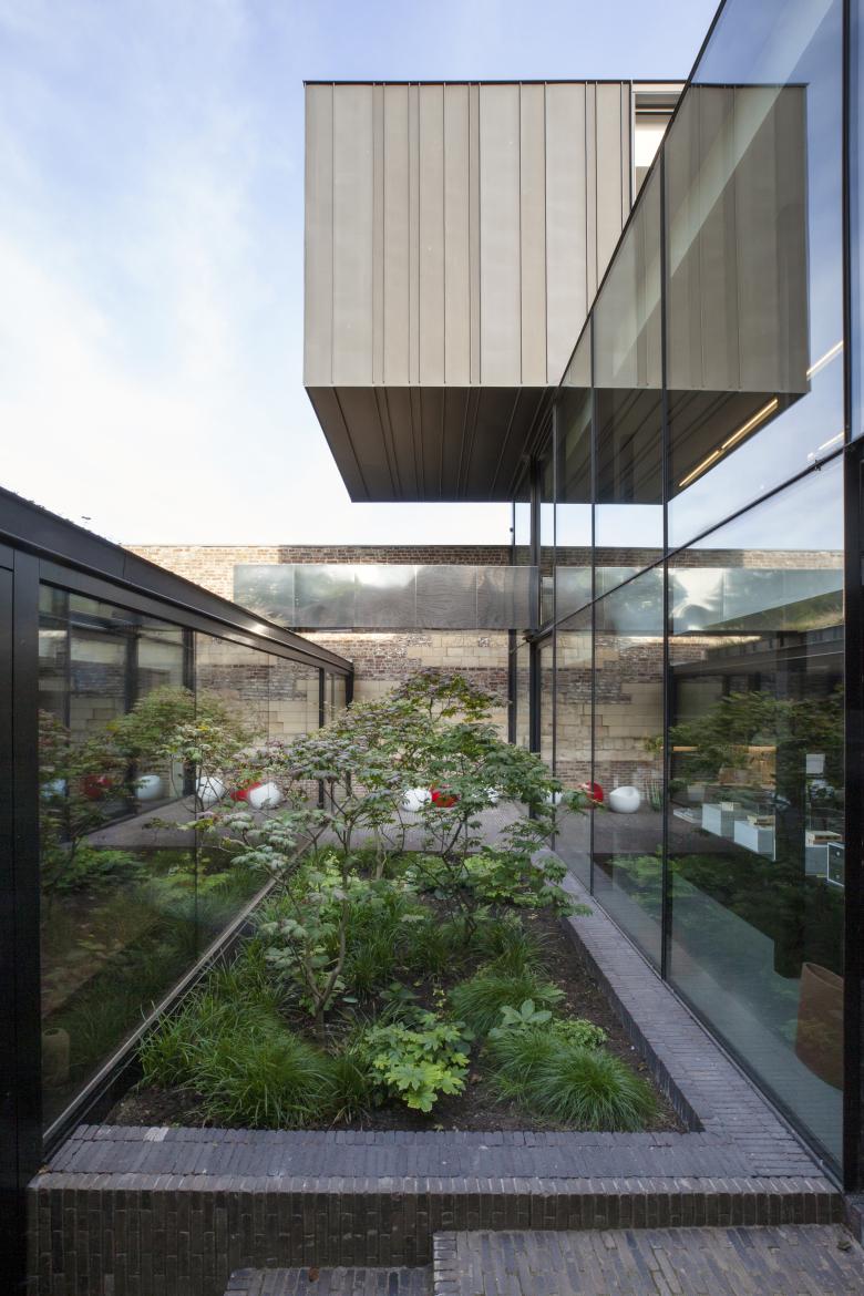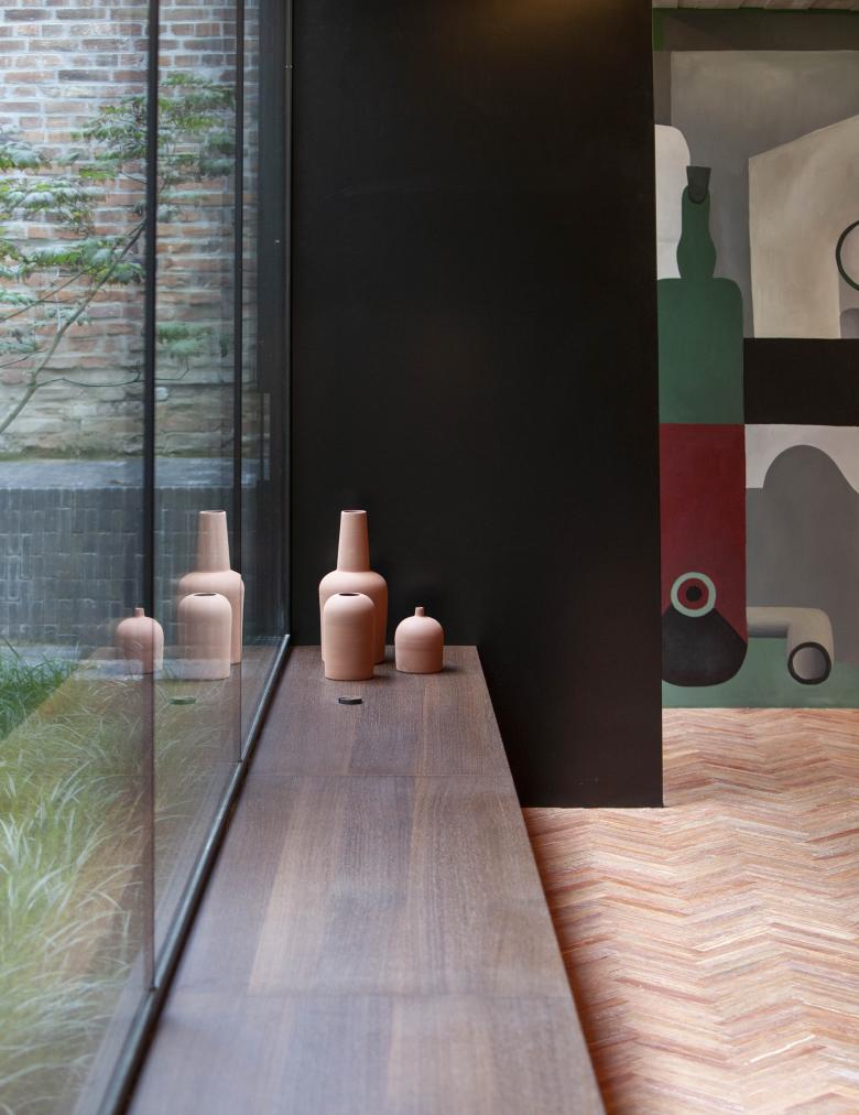 The pavilion occupies the ground floor, but its position on a sloping site allows it to sink into the backyard. The placement of the extension creates a patio between the old and new structures. This green courtyard provides a pleasant space to linger. Thanks to a green roof, the pavilion blends seamlessly with the surrounding landscape. The cleverly designed roof garden also serves a functional purpose: the clay-brick footpath continues into a long bench, which aligns perfectly with the pavilion’s floating ribbon window. A stainless steel walkway connects the office space to the roof garden. Its reflective material mirrors the courtyard and the adjacent marl wall, allowing the structure to recede into the background. Positioned under the cantilevered volume of the pavilion, the walkway also doubles as a covered terrace.